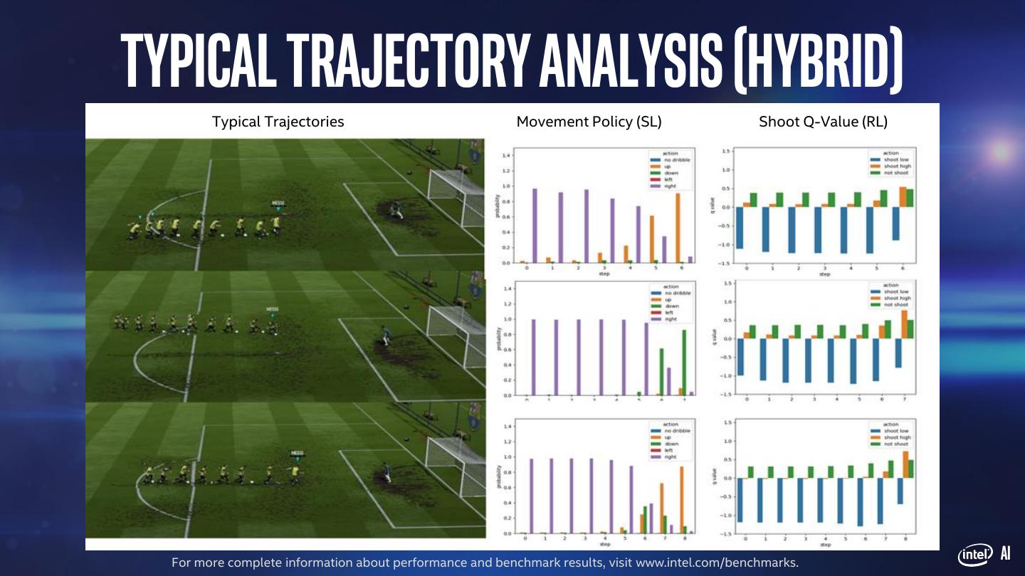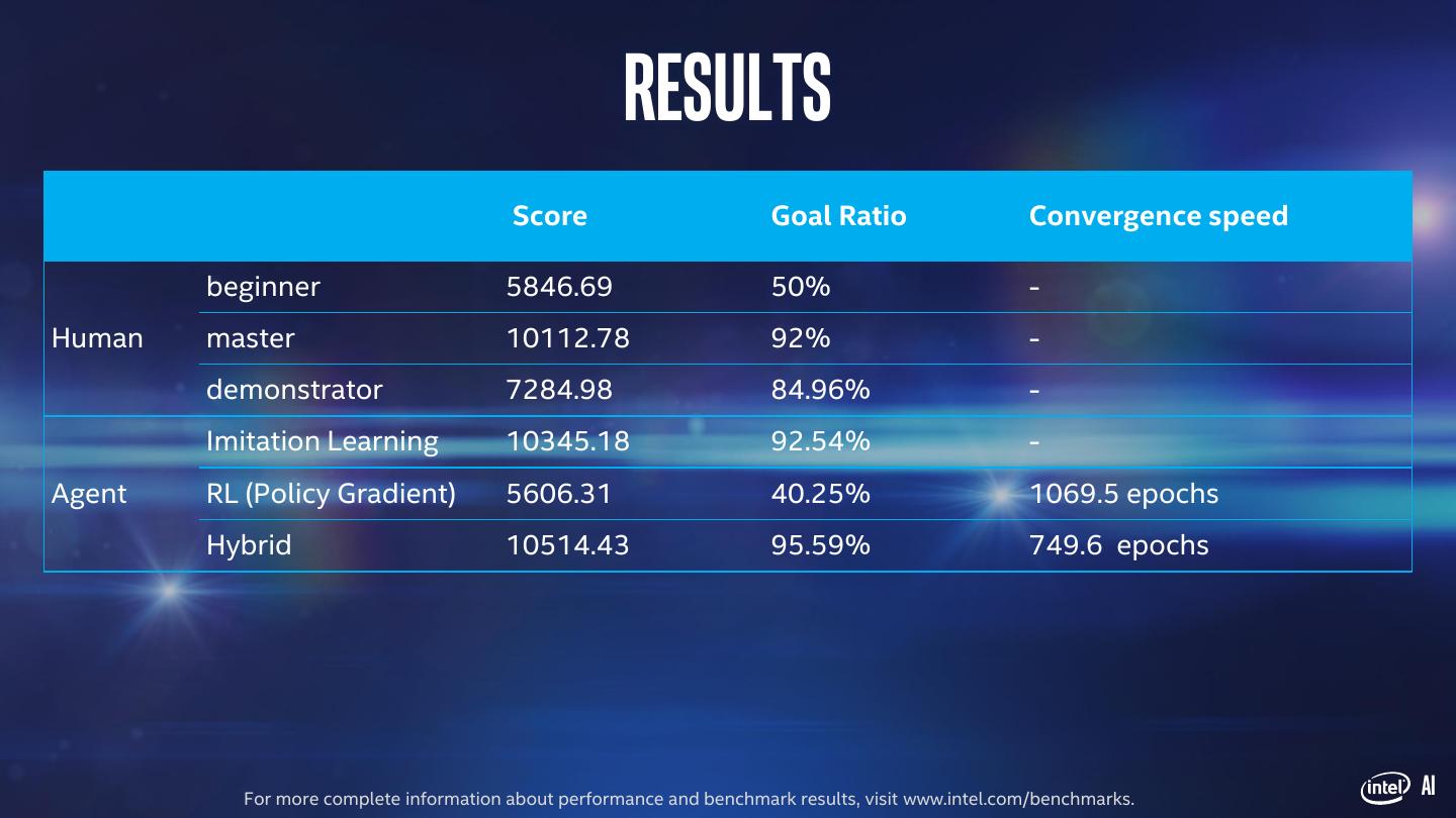 22 . Results Score Goal Ratio Convergence speed beginner 5846.69 50% - Human master 10112.78 92% - demonstrator 7284.98 84.96% - Imitation Learning 10345.18 92.54% - Agent RL (Policy Gradient) 5606.31 40.25% 1069.5 epochs Hybrid 10514.43 95.59% 749.6 epochs For more complete information about performance and benchmark results, visit www.intel.com/benchmarks. AI