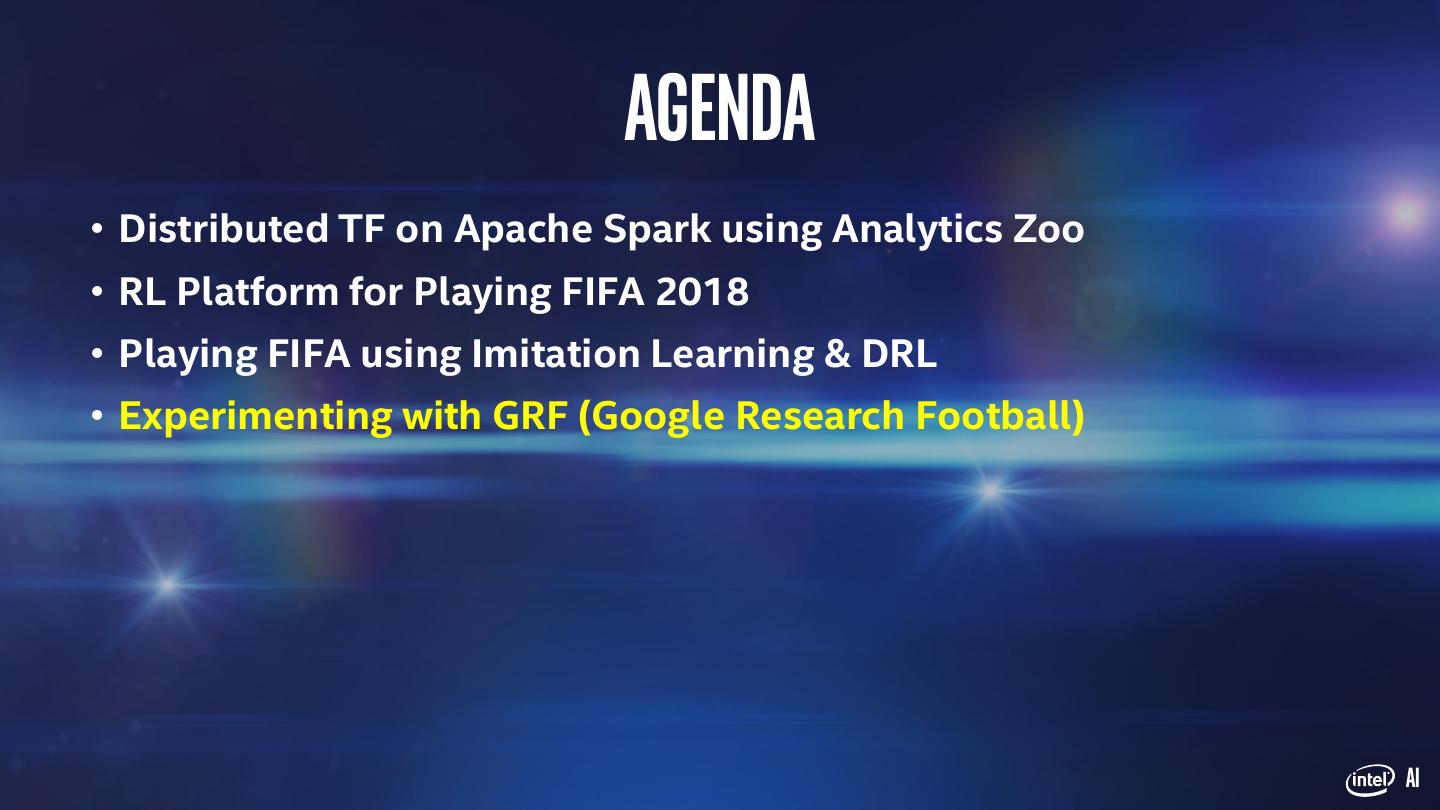 3 . Agenda • Distributed TF on Apache Spark* using Analytics Zoo • RL Platform for Playing FIFA18 • Playing FIFA18 using Imitation Learning & DRL • Experimenting with GRF (Google Research Football*) AI