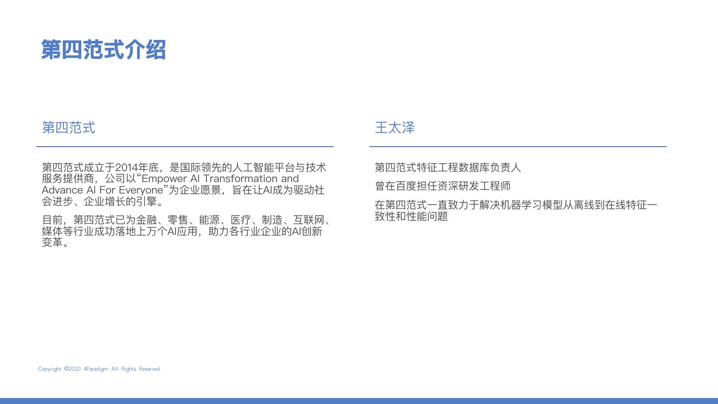 2 .第四范式介绍 第四范式 王太泽 第四范式成立于2014年底,是国际领先的人工智能平台与技术 第四范式特征工程数据库负责人 服务提供商,公司以“Empower AI Transformation and Advance AI For Everyone”为企业愿景,旨在让AI成为驱动社 曾在百度担任资深研发工程师 会进步、企业增长的引擎。 在第四范式一直致力于解决机器学习模型从离线到在线特征一 目前,第四范式已为金融、零售、能源、医疗、制造、互联网、 致性和性能问题 媒体等行业成功落地上万个AI应用,助力各行业企业的AI创新 变革。 Copyright ©2020 4Paradigm All Rights Reserved.