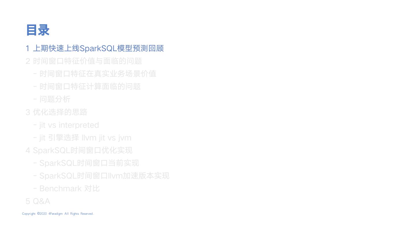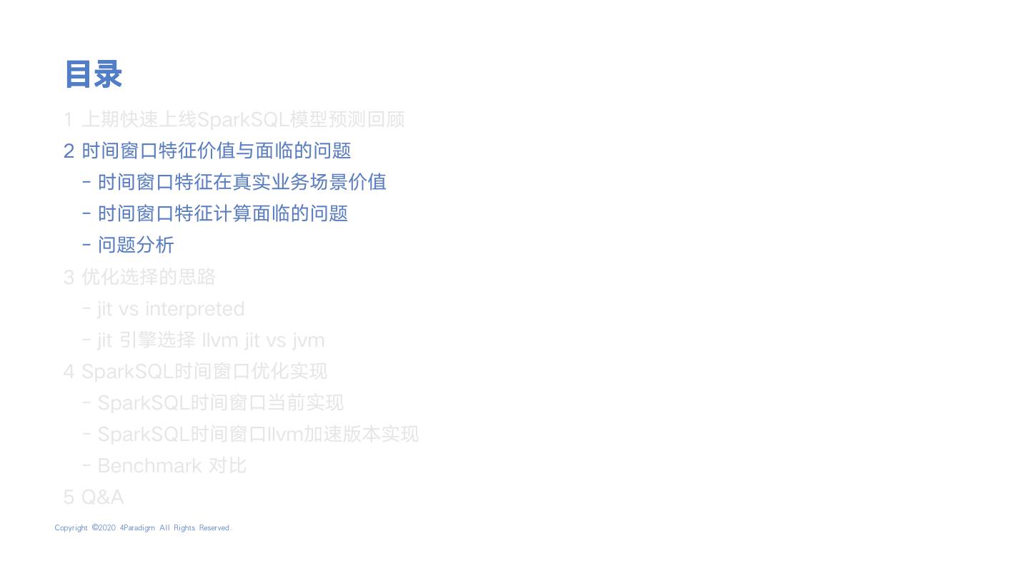4 . 目录 1 上期快速上线SparkSQL模型预测回顾 2 时间窗口特征价值与面临的问题 - 时间窗口特征在真实业务场景价值 - 时间窗口特征计算面临的问题 - 问题分析 3 优化选择的思路 - jit vs interpreted - jit 引擎选择 llvm jit vs jvm 4 SparkSQL时间窗口优化实现 - SparkSQL时间窗口当前实现 - SparkSQL时间窗口llvm加速版本实现 - Benchmark 对比 5 Q&A Copyright ©2020 4Paradigm All Rights Reserved.