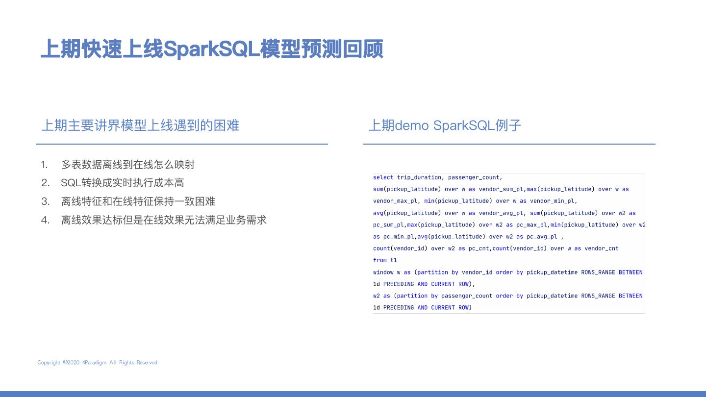 3 . 目录 1 上期快速上线SparkSQL模型预测回顾 2 时间窗口特征价值与面临的问题 - 时间窗口特征在真实业务场景价值 - 时间窗口特征计算面临的问题 - 问题分析 3 优化选择的思路 - jit vs interpreted - jit 引擎选择 llvm jit vs jvm 4 SparkSQL时间窗口优化实现 - SparkSQL时间窗口当前实现 - SparkSQL时间窗口llvm加速版本实现 - Benchmark 对比 5 Q&A Copyright ©2020 4Paradigm All Rights Reserved.