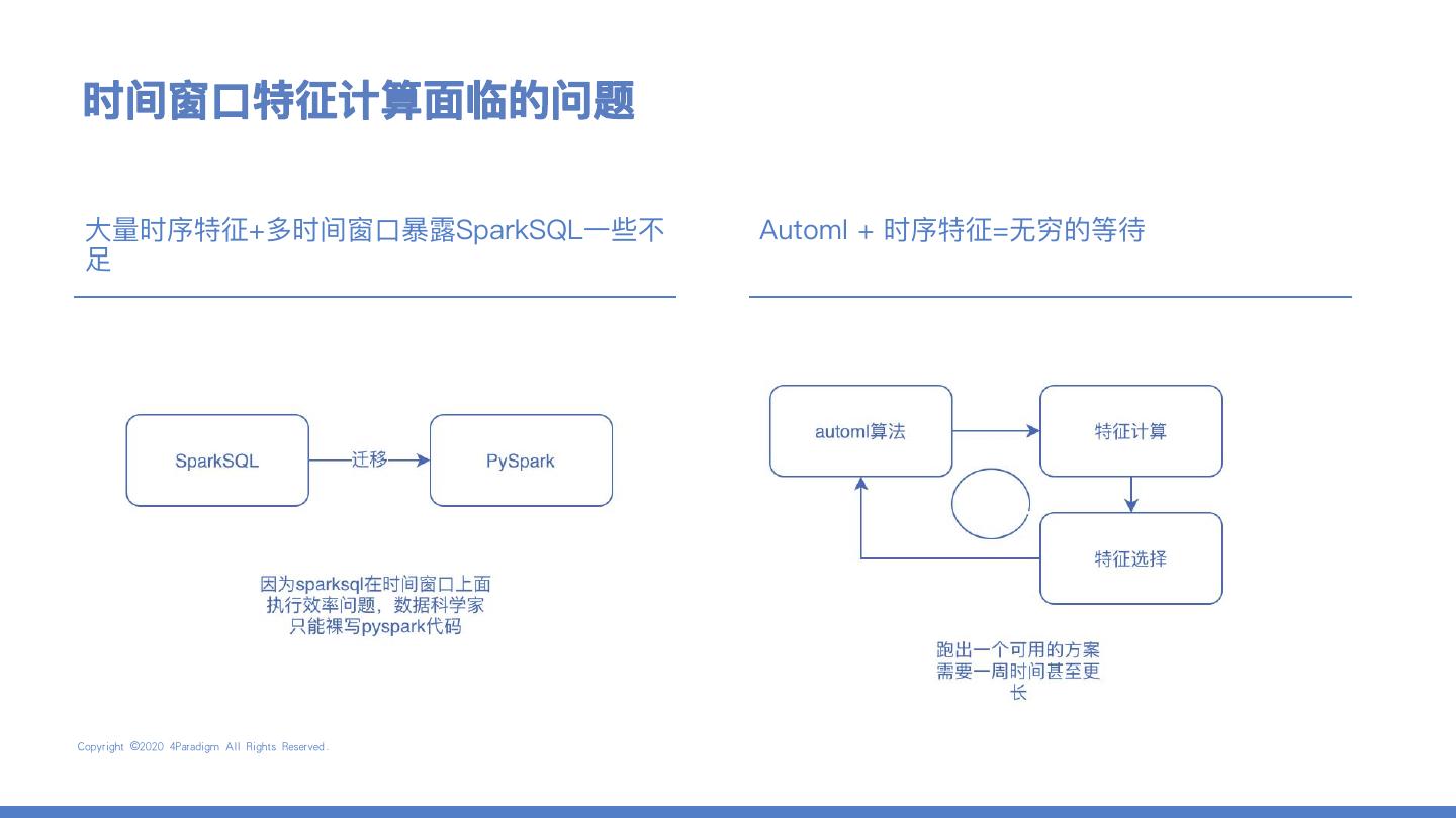 8 .时间窗口特征计算面临的问题 大量时序特征+多时间窗口暴露SparkSQL一些不 Automl + 时序特征=无穷的等待 足 Copyright ©2020 4Paradigm All Rights Reserved.