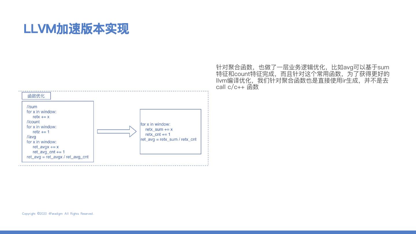 17 .LLVM加速版本实现 针对聚合函数,也做了一层业务逻辑优化,比如avg可以基于sum 特征和count特征完成,而且针对这个常用函数,为了获得更好的 llvm编译优化,我们针对聚合函数也是直接使用ir生成,并不是去 call c/c++ 函数 Copyright ©2020 4Paradigm All Rights Reserved.