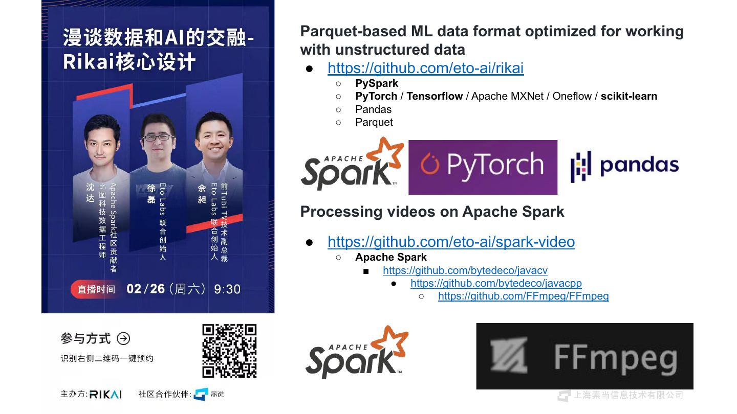 2 .Parquet-based ML data format optimized for working with unstructured data ● https://github.com/eto-ai/rikai ○ PySpark ○ PyTorch / Tensorflow / Apache MXNet / Oneflow / scikit-learn ○ Pandas ○ Parquet Processing videos on Apache Spark ● https://github.com/eto-ai/spark-video ○ Apache Spark ■ https://github.com/bytedeco/javacv ● https://github.com/bytedeco/javacpp ○ https://github.com/FFmpeg/FFmpeg 上海素当信息技术有限公司