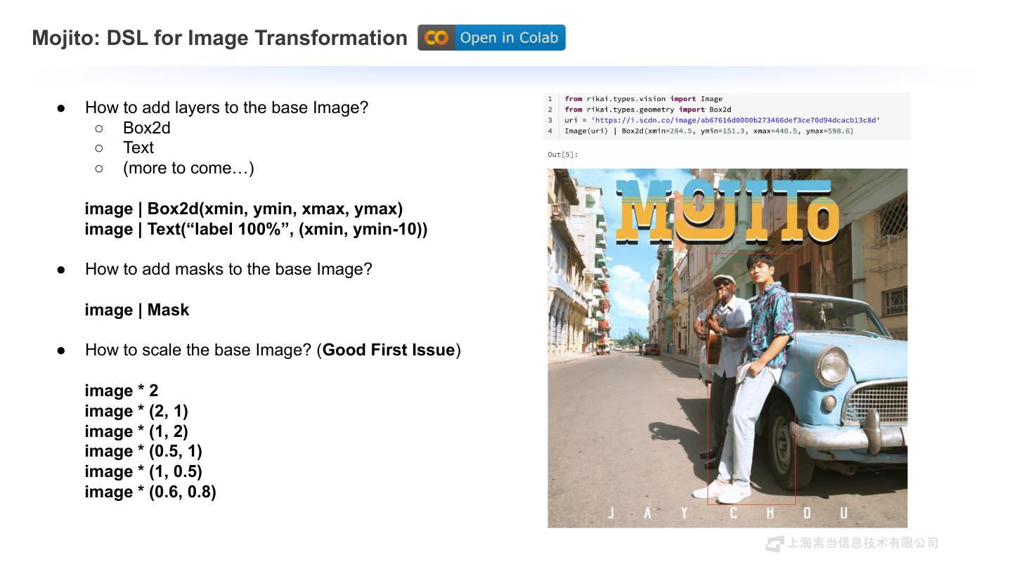 10 .Mojito: DSL for Image Transformation ● How to add layers to the base Image? ○ Box2d ○ Text ○ (more to come…) image | Box2d(xmin, ymin, xmax, ymax) image | Text(“label 100%”, (xmin, ymin-10)) ● How to add masks to the base Image? image | Mask ● How to scale the base Image? (Good First Issue) image * 2 image * (2, 1) image * (1, 2) image * (0.5, 1) image * (1, 0.5) image * (0.6, 0.8) 上海素当信息技术有限公司