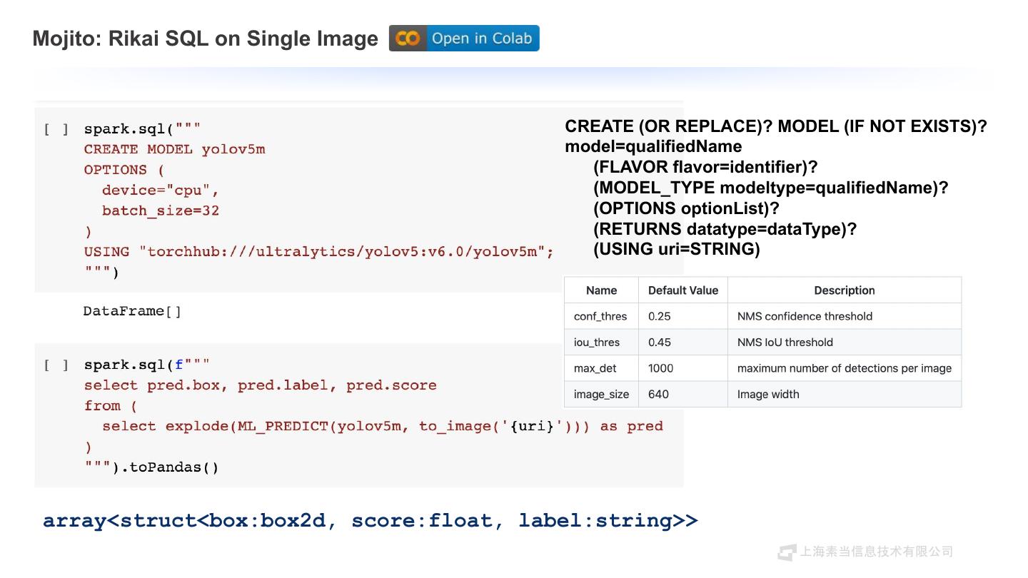 11 .Mojito: Rikai SQL on Single Image CREATE (OR REPLACE)? MODEL (IF NOT EXISTS)? model=qualifiedName (FLAVOR flavor=identifier)? (MODEL_TYPE modeltype=qualifiedName)? (OPTIONS optionList)? (RETURNS datatype=dataType)? (USING uri=STRING) array<struct<box:box2d, score:float, label:string>> 上海素当信息技术有限公司