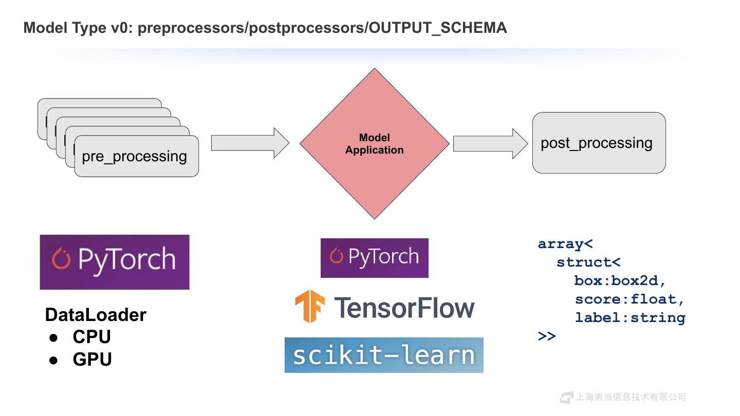 14 .Model Type v0: preprocessors/postprocessors/OUTPUT_SCHEMA pre_processing pre_processing pre_processing Model post_processing pre_processing Application pre_processing array< struct< box:box2d, score:float, DataLoader label:string ● CPU >> ● GPU 上海素当信息技术有限公司