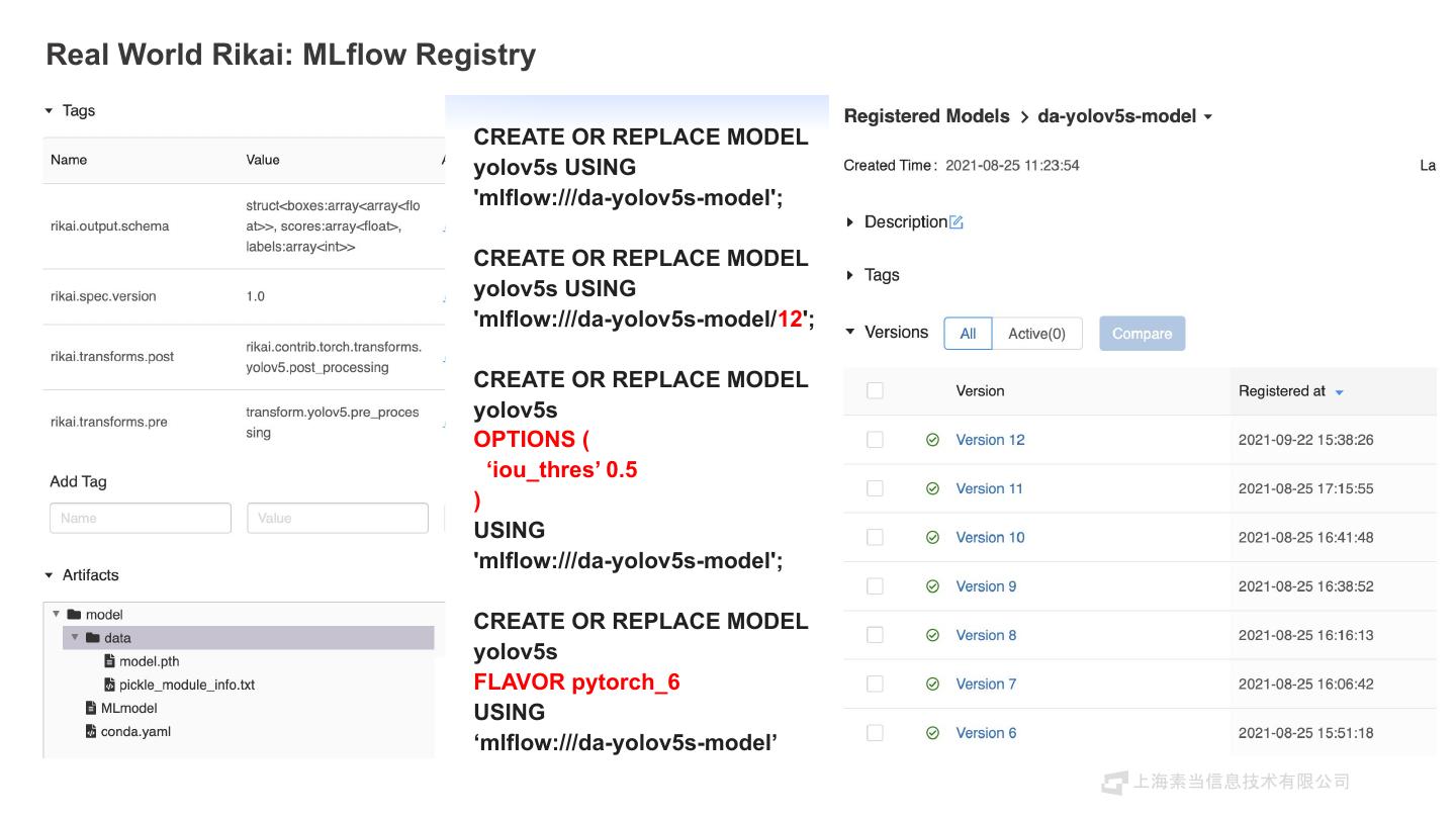 15 .Real World Rikai: MLflow Registry CREATE OR REPLACE MODEL yolov5s USING 'mlflow:///da-yolov5s-model'; CREATE OR REPLACE MODEL yolov5s USING 'mlflow:///da-yolov5s-model/12'; CREATE OR REPLACE MODEL yolov5s OPTIONS ( ‘iou_thres’ 0.5 ) USING 'mlflow:///da-yolov5s-model'; CREATE OR REPLACE MODEL yolov5s FLAVOR pytorch_6 USING ‘mlflow:///da-yolov5s-model’ 上海素当信息技术有限公司