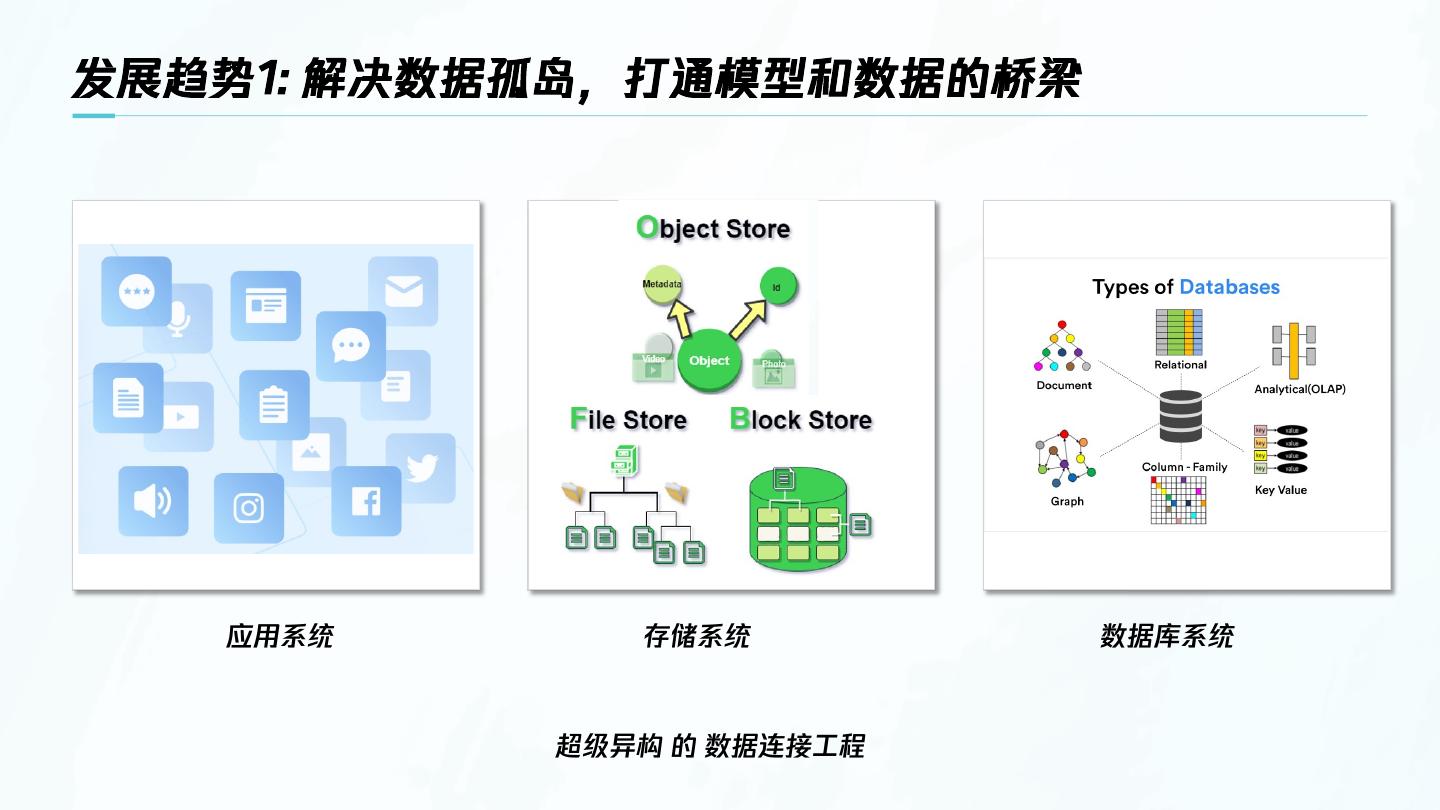 6 .发展趋势1: 解决数据孤岛,打通模型和数据的桥梁 应⽤系统 存储系统 数据库系统 超级异构 的 数据连接⼯程