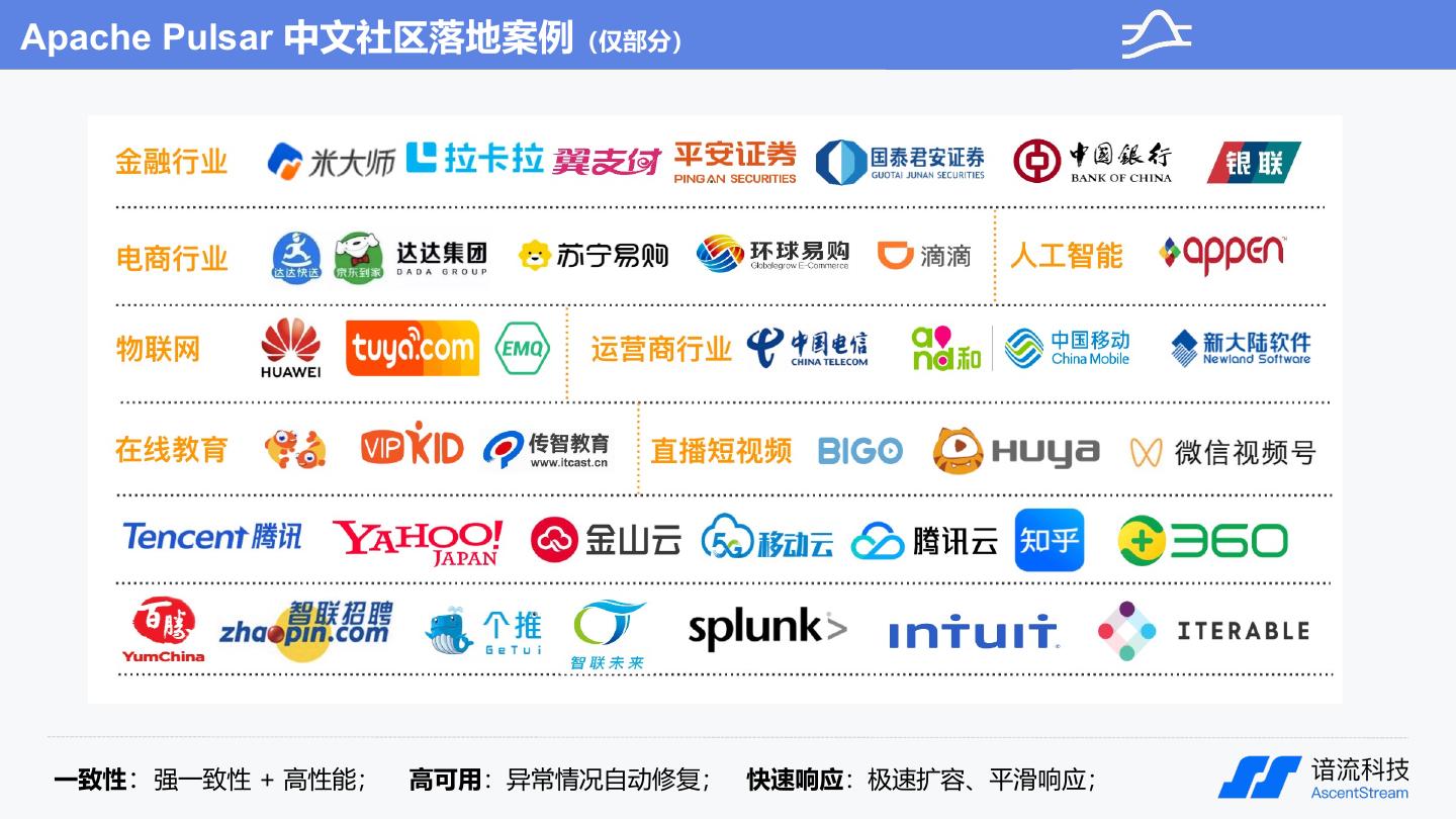 3 .Apache Pulsar 中文社区落地案例(仅部分) 一致性:强一致性 + 高性能; 高可用:异常情况自动修复; 快速响应:极速扩容、平滑响应;