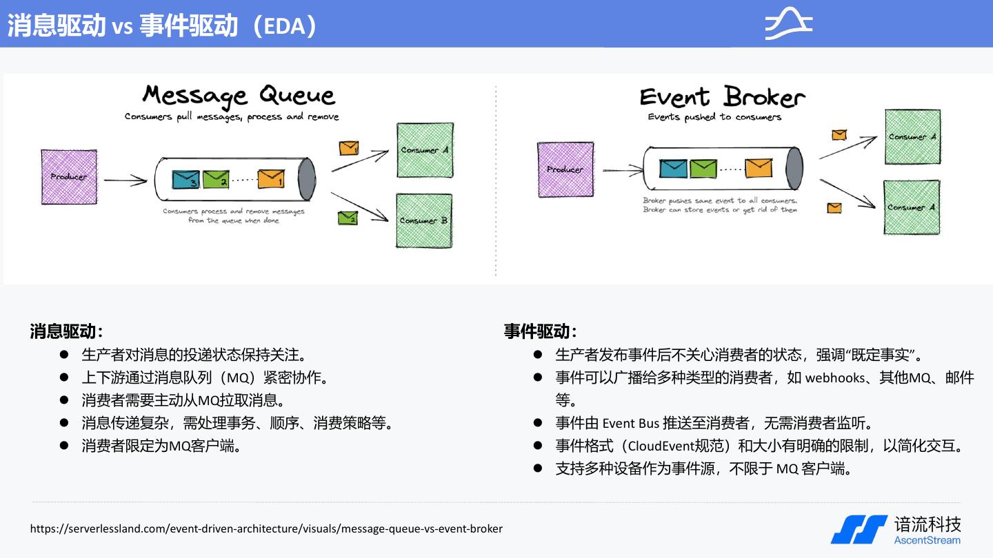 7 .消息驱动 vs 事件驱动(EDA) 消息驱动: 事件驱动: l 生产者对消息的投递状态保持关注。 l 生产者发布事件后不关心消费者的状态,强调“既定事实”。 l 上下游通过消息队列(MQ)紧密协作。 l 事件可以广播给多种类型的消费者,如 webhooks、其他MQ、邮件 l 消费者需要主动从MQ拉取消息。 等。 l 消息传递复杂,需处理事务、顺序、消费策略等。 l 事件由 Event Bus 推送至消费者,无需消费者监听。 l 消费者限定为MQ客户端。 l 事件格式(CloudEvent规范)和大小有明确的限制,以简化交互。 l 支持多种设备作为事件源,不限于 MQ 客户端。 https://serverlessland.com/event-driven-architecture/visuals/message-queue-vs-event-broker