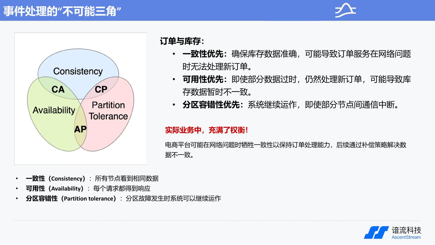 8 .事件处理的“不可能三角” 订单与库存: • 一致性优先:确保库存数据准确,可能导致订单服务在网络问题 时无法处理新订单。 • 可用性优先:即使部分数据过时,仍然处理新订单,可能导致库 存数据暂时不一致。 • 分区容错性优先:系统继续运作,即使部分节点间通信中断。 实际业务中,充满了权衡! 电商平台可能在网络问题时牺牲一致性以保持订单处理能力,后续通过补偿策略解决数 据不一致。 • 一致性(Consistency):所有节点看到相同数据 • 可用性(Availability):每个请求都得到响应 • 分区容错性(Partition tolerance):分区故障发生时系统可以继续运作