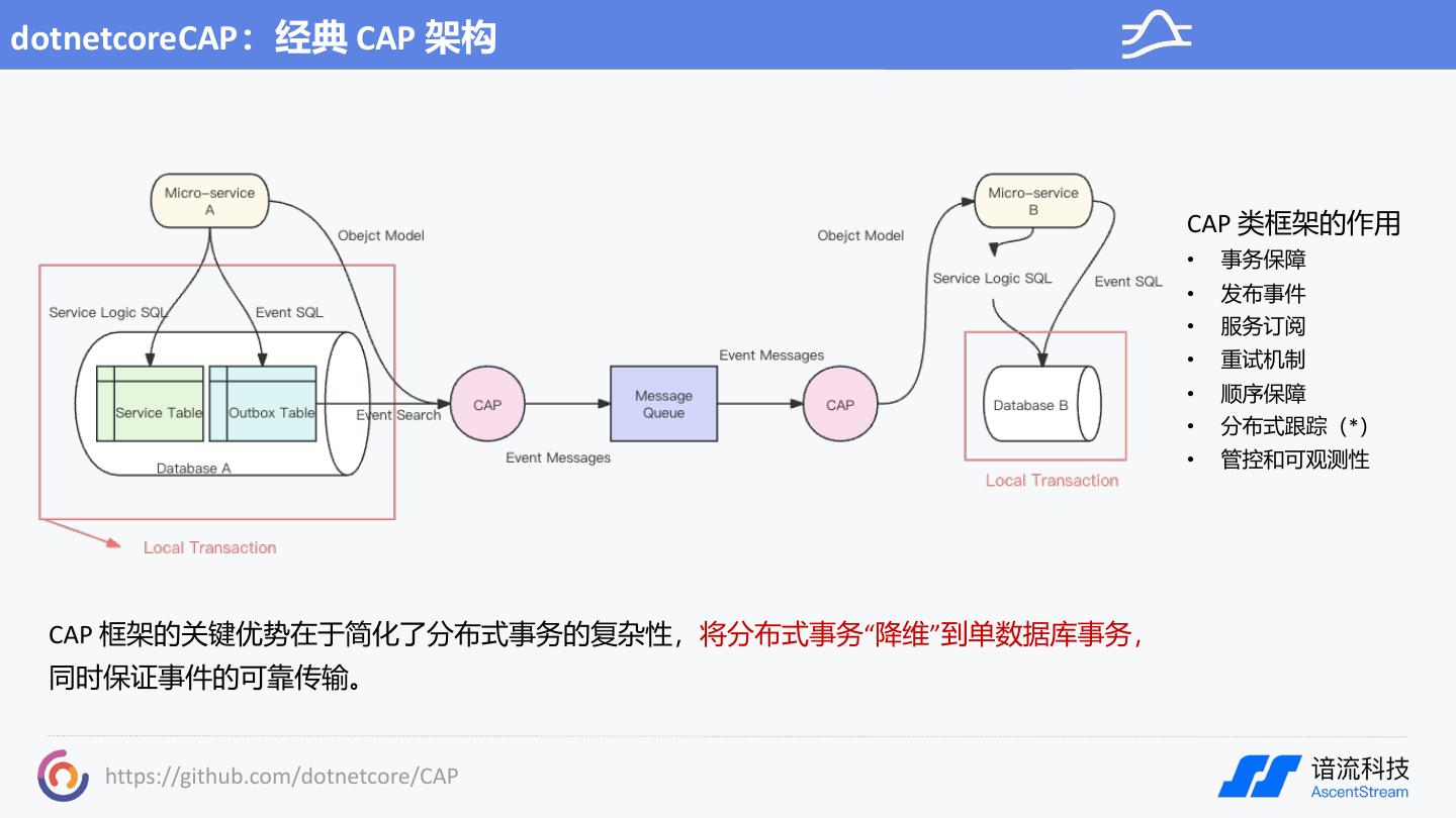 9 .dotnetcoreCAP:经典 CAP 架构 CAP 类框架的作用 • 事务保障 • 发布事件 • 服务订阅 • 重试机制 • 顺序保障 • 分布式跟踪(*) • 管控和可观测性 CAP 框架的关键优势在于简化了分布式事务的复杂性,将分布式事务“降维”到单数据库事务, 同时保证事件的可靠传输。 https://github.com/dotnetcore/CAP