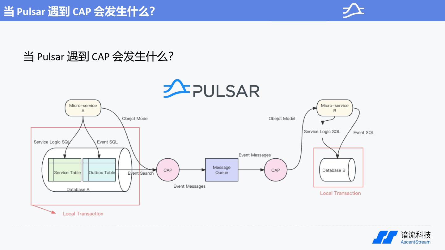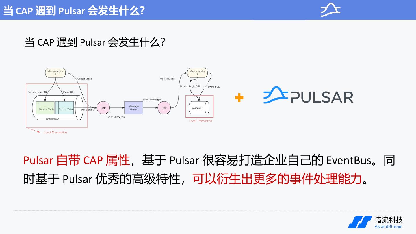 17 .当 CAP 遇到 Pulsar 会发生什么? 当 CAP 遇到 Pulsar 会发生什么? Pulsar 自带 CAP 属性,基于 Pulsar 很容易打造企业自己的 EventBus。同 时基于 Pulsar 优秀的高级特性,可以衍生出更多的事件处理能力。