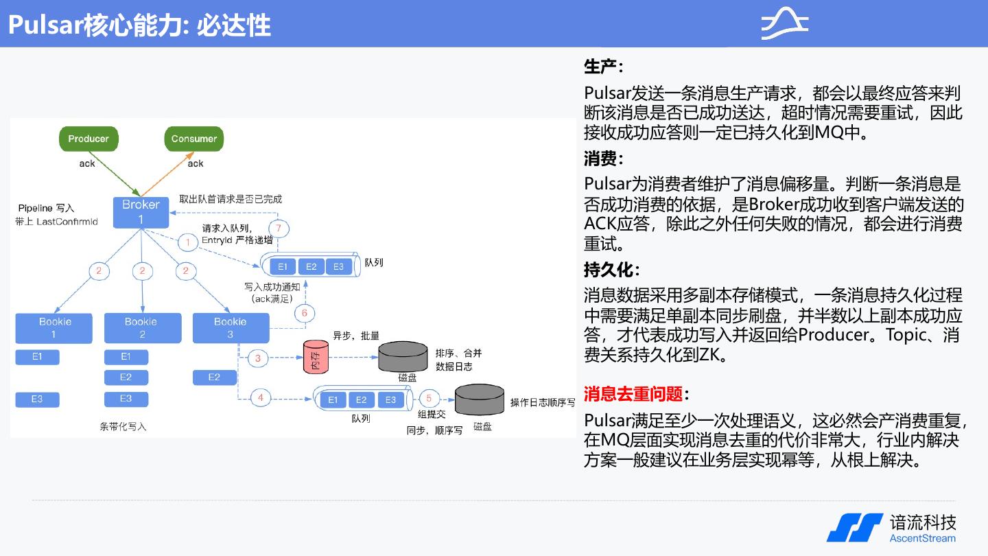 11 .Pulsar核心能力: 必达性 生产: Pulsar发送一条消息生产请求,都会以最终应答来判 断该消息是否已成功送达,超时情况需要重试,因此 接收成功应答则一定已持久化到MQ中。 消费: Pulsar为消费者维护了消息偏移量。判断一条消息是 否成功消费的依据,是Broker成功收到客户端发送的 ACK应答,除此之外任何失败的情况,都会进行消费 重试。 持久化: 消息数据采用多副本存储模式,一条消息持久化过程 中需要满足单副本同步刷盘,并半数以上副本成功应 答,才代表成功写入并返回给Producer。Topic、消 费关系持久化到ZK。 消息去重问题: Pulsar满足至少一次处理语义,这必然会产消费重复, 在MQ层面实现消息去重的代价非常大,行业内解决 方案一般建议在业务层实现幂等,从根上解决。