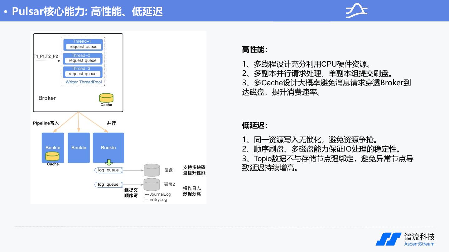 13 .• Pulsar核心能力: 高性能、低延迟 高性能: 1、多线程设计充分利用CPU硬件资源。 2、多副本并行请求处理,单副本组提交刷盘。 3、多Cache设计大概率避免消息请求穿透Broker到 达磁盘,提升消费速率。 低延迟: 1、同一资源写入无锁化,避免资源争抢。 2、顺序刷盘、多磁盘能力保证IO处理的稳定性。 3、Topic数据不与存储节点强绑定,避免异常节点导 致延迟持续增高。