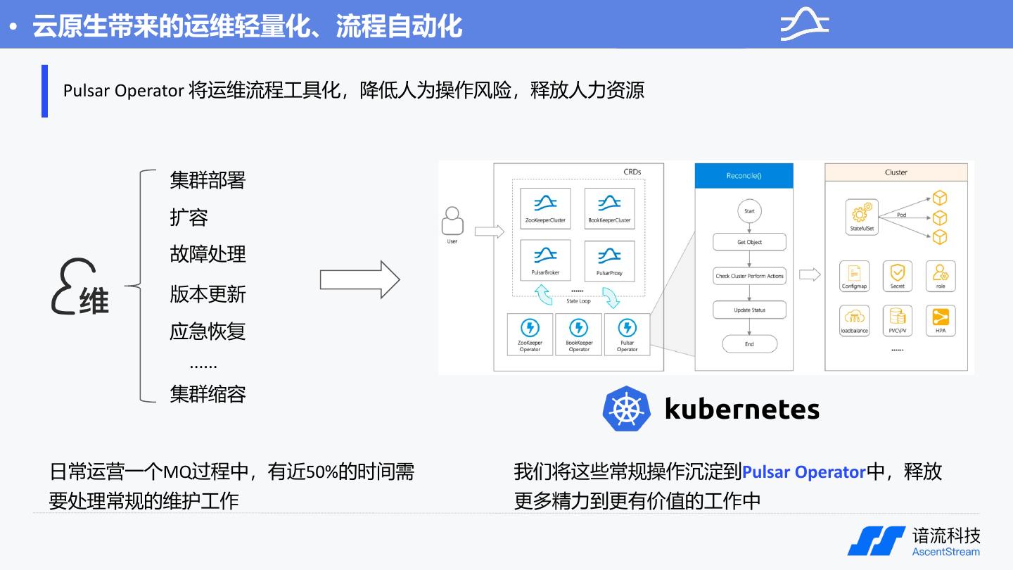 15 .• 云原生带来的运维轻量化、流程自动化 Pulsar Operator 将运维流程工具化,降低人为操作风险,释放人力资源 集群部署 扩容 故障处理 版本更新 应急恢复 ...... 集群缩容 日常运营一个MQ过程中,有近50%的时间需 我们将这些常规操作沉淀到Pulsar Operator中,释放 要处理常规的维护工作 更多精力到更有价值的工作中