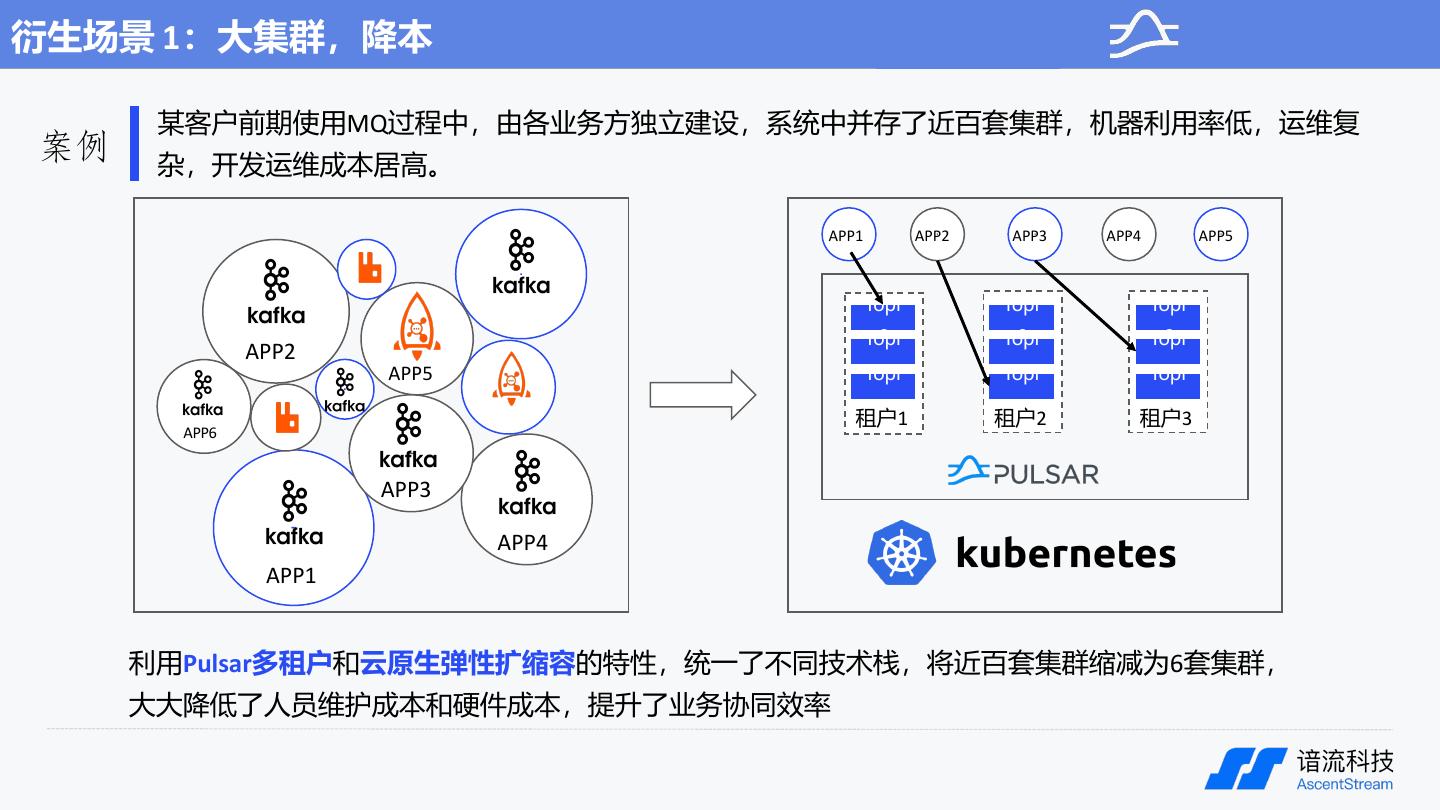 18 .衍生场景 1:大集群,降本 某客户前期使用MQ过程中,由各业务方独立建设,系统中并存了近百套集群,机器利用率低,运维复 案例 杂,开发运维成本居高。 APP1 APP2 APP3 APP4 APP5 Topi Topi Topi c Topi c Topi c Topi APP2 APP5 c Topi c Topi c Topi c c c 租户1 租户2 租户3 APP6 APP3 APP4 APP1 利用Pulsar多租户和云原生弹性扩缩容的特性,统一了不同技术栈,将近百套集群缩减为6套集群, 大大降低了人员维护成本和硬件成本,提升了业务协同效率