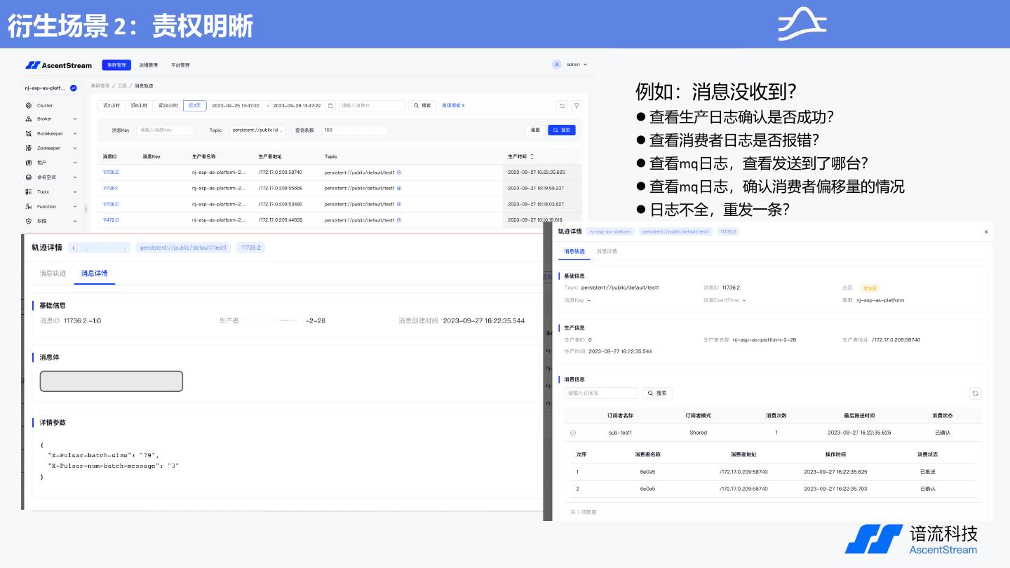 19 .衍生场景 2:责权明晰 例如:消息没收到? l 查看生产日志确认是否成功? l 查看消费者日志是否报错? l 查看mq日志,查看发送到了哪台? l 查看mq日志,确认消费者偏移量的情况 l 日志不全,重发一条?
