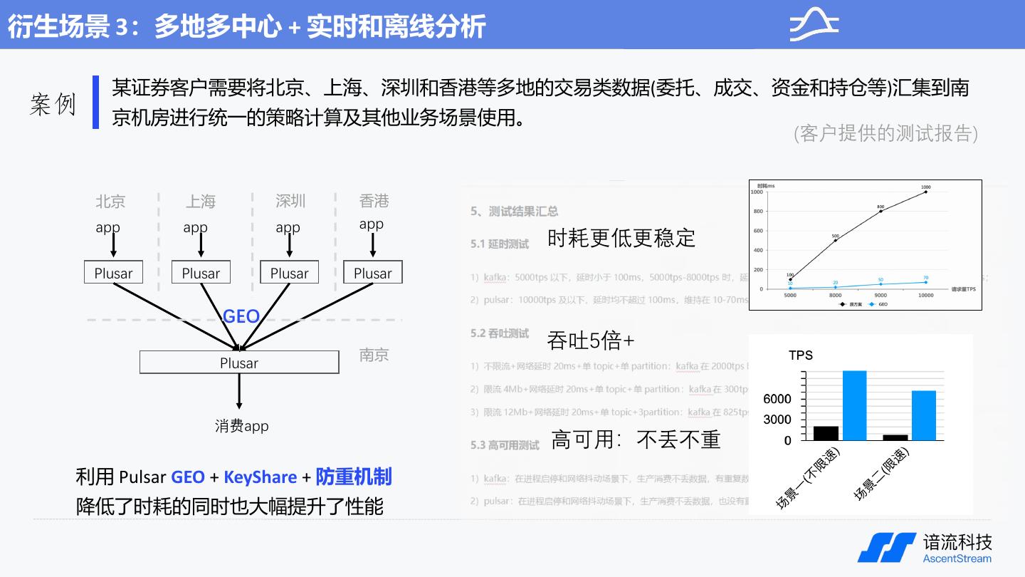20 .衍生场景 3:多地多中心 + 实时和离线分析 某证券客户需要将北京、上海、深圳和香港等多地的交易类数据(委托、成交、资金和持仓等)汇集到南 案例 京机房进行统一的策略计算及其他业务场景使用。 (客户提供的测试报告) 北京 上海 深圳 香港 app app app app 时耗更低更稳定 Plusar Plusar Plusar Plusar GEO 吞吐5倍+ 南京 Plusar 消费app ⾼可⽤:不丢不重 利用 Pulsar GEO + KeyShare + 防重机制 降低了时耗的同时也大幅提升了性能