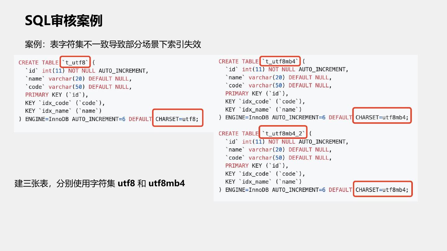 6 . SQL审核案例 案例:表字符集不一致导致部分场景下索引失效 建三张表,分别使用字符集 utf8 和 utf8mb4