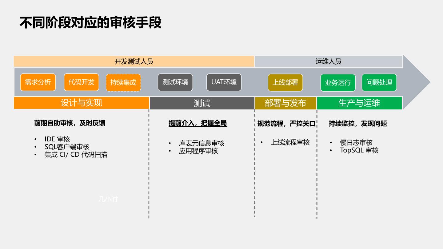 15 .不同阶段对应的审核手段 开发测试人员 运维人员 需求分析 代码开发 持续集成 测试环境 UAT环境 上线部署 业务运行 问题处理 设计与实现 测试 部署与发布 生产与运维 前期自助审核,及时反馈 提前介入,把握全局 规范流程,严控关口 持续监控,发现问题 • IDE 审核 • 上线流程审核 • 库表元信息审核 • 慢日志审核 • SQL客户端审核 • 应用程序审核 • TopSQL 审核 • 集成 CI/ CD 代码扫描 几小时