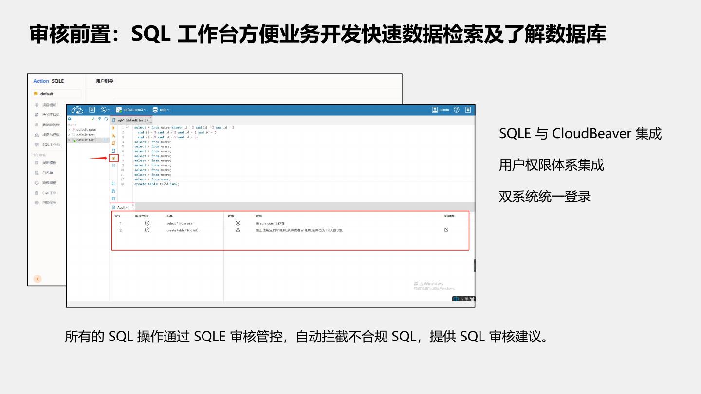 17 .审核前置:SQL 工作台方便业务开发快速数据检索及了解数据库 SQLE 与 CloudBeaver 集成 用户权限体系集成 双系统统一登录 所有的 SQL 操作通过 SQLE 审核管控,自动拦截不合规 SQL,提供 SQL 审核建议。