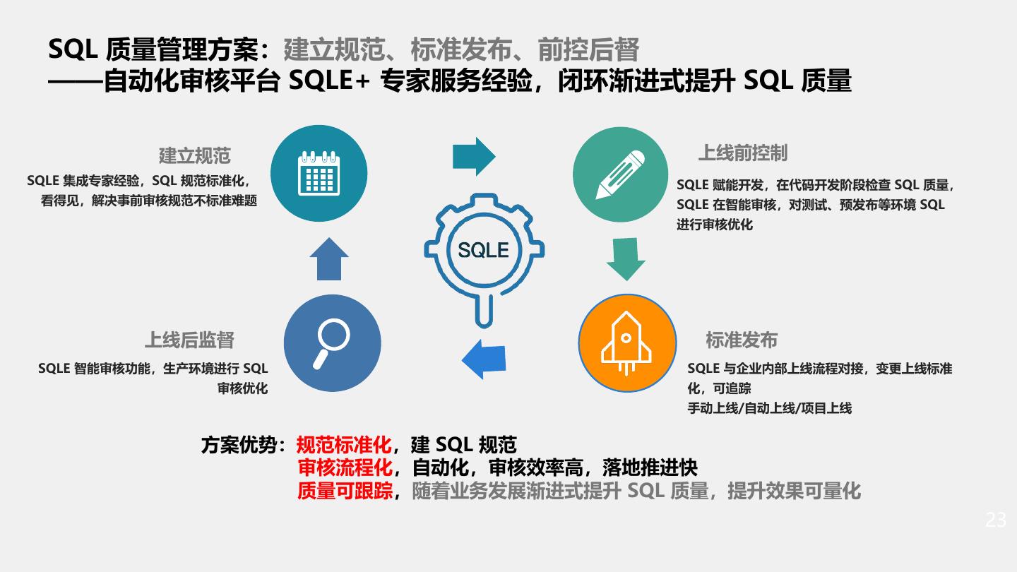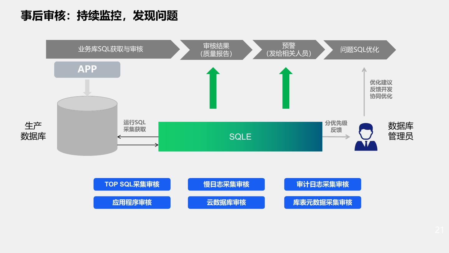 21 .事后审核:持续监控,发现问题 审核结果 预警 业务库SQL获取与审核 问题SQL优化 (质量报告) (发给相关人员) APP 优化建议 反馈开发 协同优化 运行SQL 分优先级 生产 采集获取 反馈 数据库 数据库 SQLE 管理员 TOP SQL采集审核 慢日志采集审核 审计日志采集审核 应用程序审核 云数据库审核 库表元数据采集审核 21