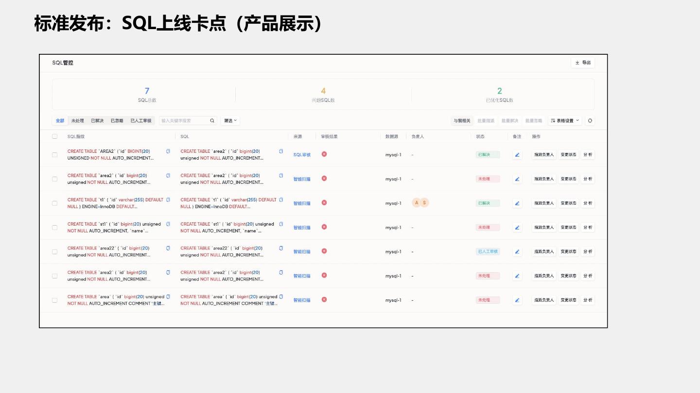 23 . SQL 质量管理方案:建立规范、标准发布、前控后督 ——自动化审核平台 SQLE+ 专家服务经验,闭环渐进式提升 SQL 质量 建立规范 上线前控制 SQLE 集成专家经验,SQL 规范标准化, SQLE 赋能开发,在代码开发阶段检查 SQL 质量, 看得见,解决事前审核规范不标准难题 SQLE 在智能审核,对测试、预发布等环境 SQL 进行审核优化 上线后监督 标准发布 SQLE 智能审核功能,生产环境进行 SQL SQLE 与企业内部上线流程对接,变更上线标准 审核优化 化,可追踪 手动上线/自动上线/项目上线 方案优势:规范标准化,建 SQL 规范 审核流程化,自动化,审核效率高,落地推进快 质量可跟踪,随着业务发展渐进式提升 SQL 质量,提升效果可量化 23