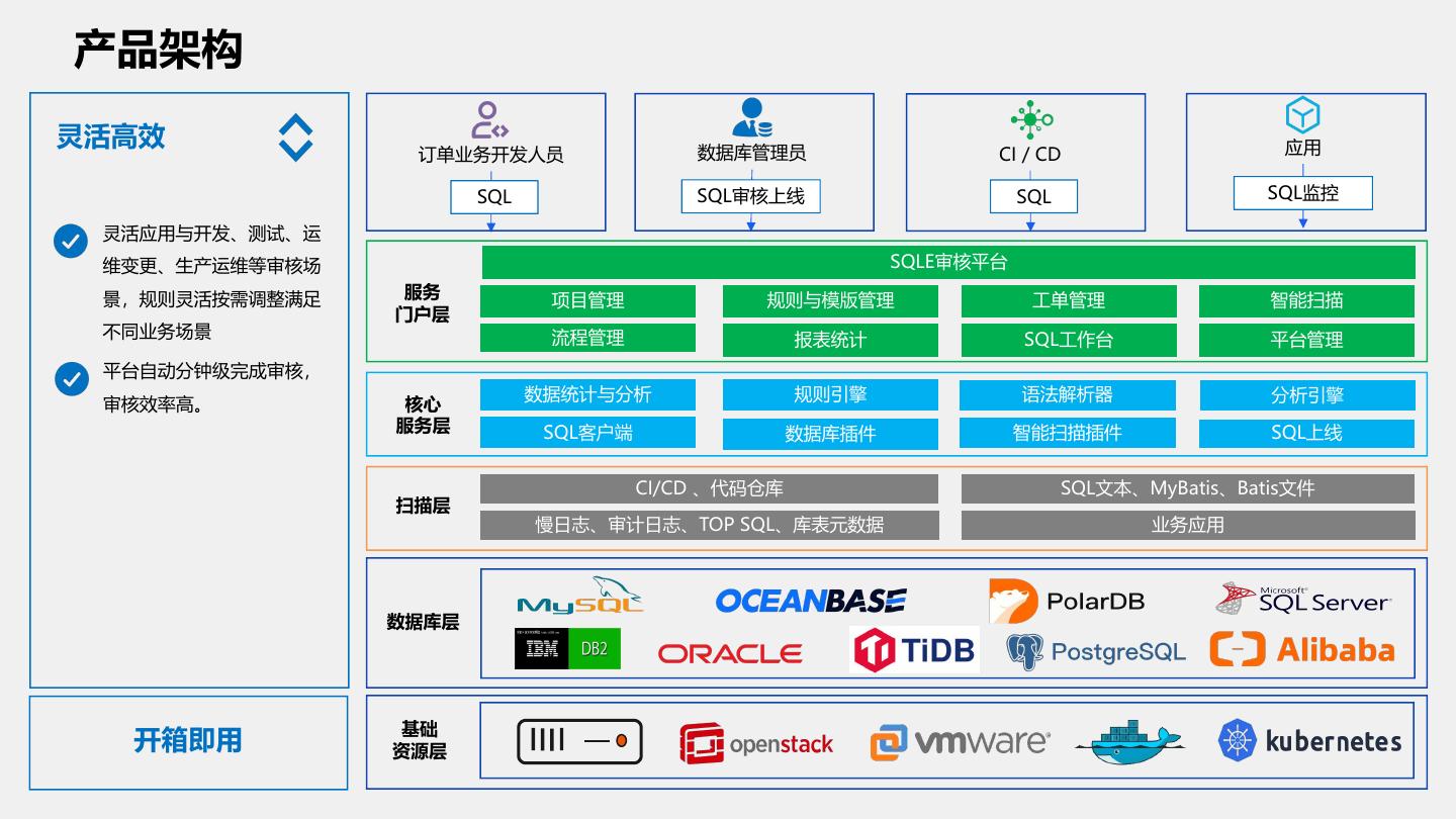 4 .什么是 SQLE? SQLE 是一款全方位的 SQL 质量管理平台,覆盖开发至生产环境的 SQL 审核和管理。 支持主流的开源、商业、国产数据库,为开发和运维提供流程自动化能力,提升上线效率,提高数据质量。 4