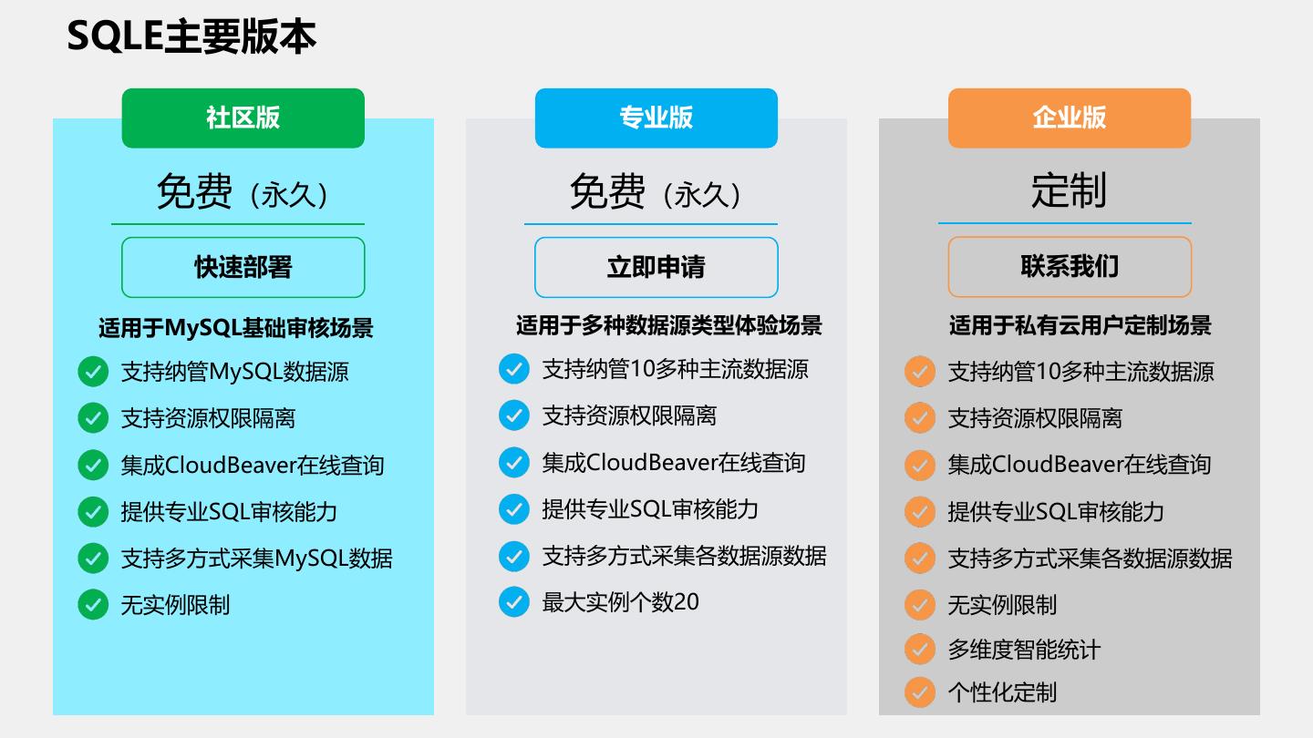 25 .SQLE主要版本 社区版 专业版 企业版 免费(永久) 免费(永久) 定制 快速部署 立即申请 联系我们 适用于MySQL基础审核场景 适用于多种数据源类型体验场景 适用于私有云用户定制场景 支持纳管MySQL数据源 支持纳管10多种主流数据源 支持纳管10多种主流数据源 支持资源权限隔离 支持资源权限隔离 支持资源权限隔离 集成CloudBeaver在线查询 集成CloudBeaver在线查询 集成CloudBeaver在线查询 提供专业SQL审核能力 提供专业SQL审核能力 提供专业SQL审核能力 支持多方式采集MySQL数据 支持多方式采集各数据源数据 支持多方式采集各数据源数据 无实例限制 最大实例个数20 无实例限制 多维度智能统计 个性化定制