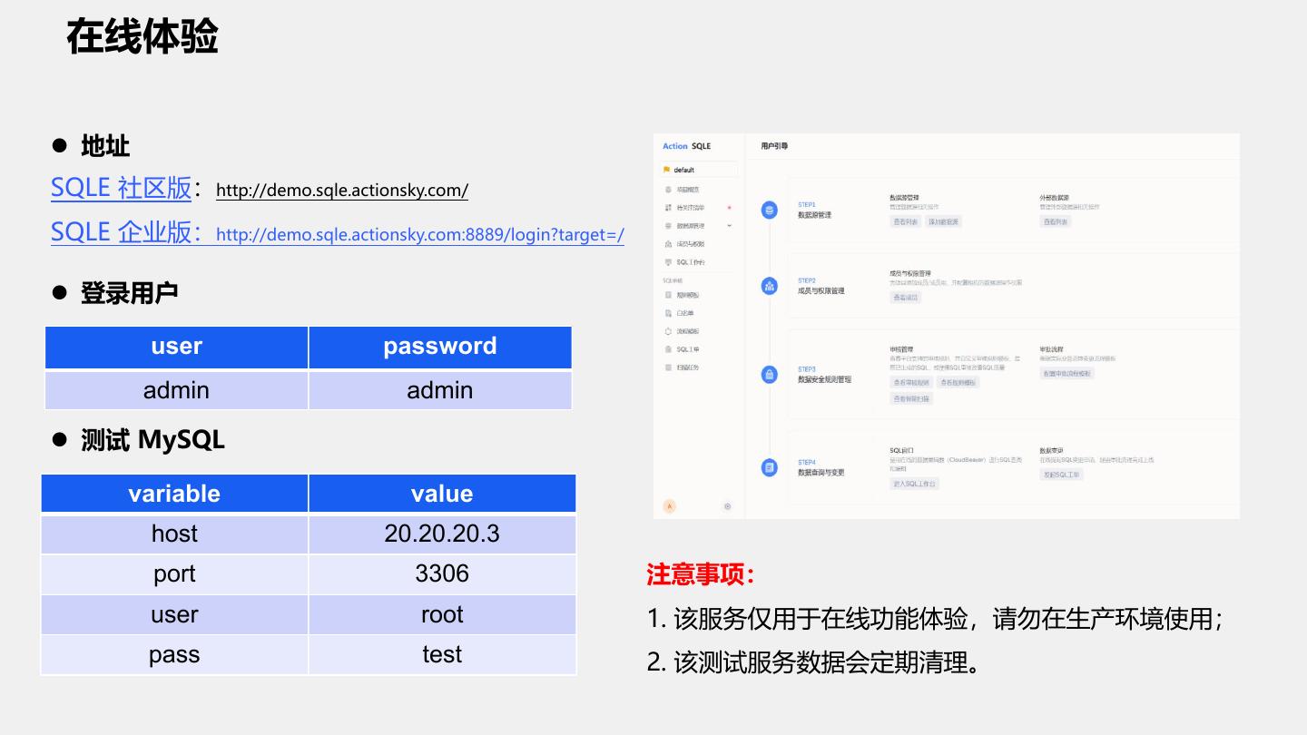 26 . 在线体验 地址 SQLE 社区版:http://demo.sqle.actionsky.com/ SQLE 企业版:http://demo.sqle.actionsky.com:8889/login?target=/ 登录用户 user password admin admin 测试 MySQL variable value host 20.20.20.3 port 3306 注意事项: user root 1. 该服务仅用于在线功能体验,请勿在生产环境使用; pass test 2. 该测试服务数据会定期清理。