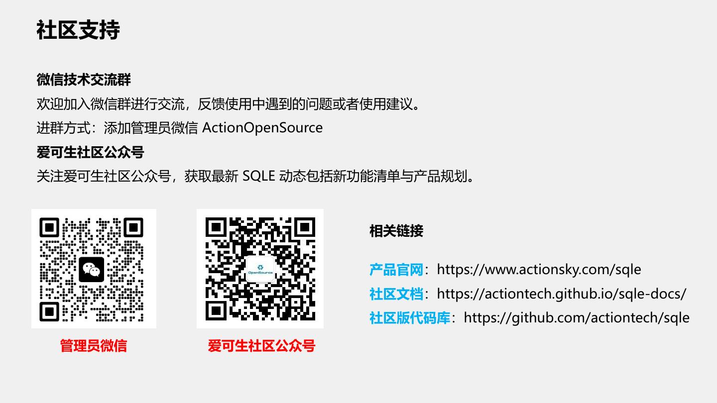 28 .社区支持 微信技术交流群 欢迎加入微信群进行交流,反馈使用中遇到的问题或者使用建议。 进群方式:添加管理员微信 ActionOpenSource 爱可生社区公众号 关注爱可生社区公众号,获取最新 SQLE 动态包括新功能清单与产品规划。 相关链接 产品官网:https://www.actionsky.com/sqle 社区文档:https://actiontech.github.io/sqle-docs/ 社区版代码库:https://github.com/actiontech/sqle 管理员微信 爱可生社区公众号