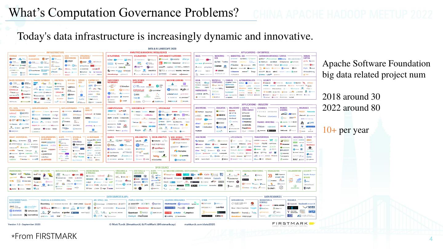 4 .What’s Computation Governance Problems? Today's data infrastructure is increasingly dynamic and innovative. Apache Software Foundation big data related project num 2018 around 30 2022 around 80 10+ per year *From FIRSTMARK