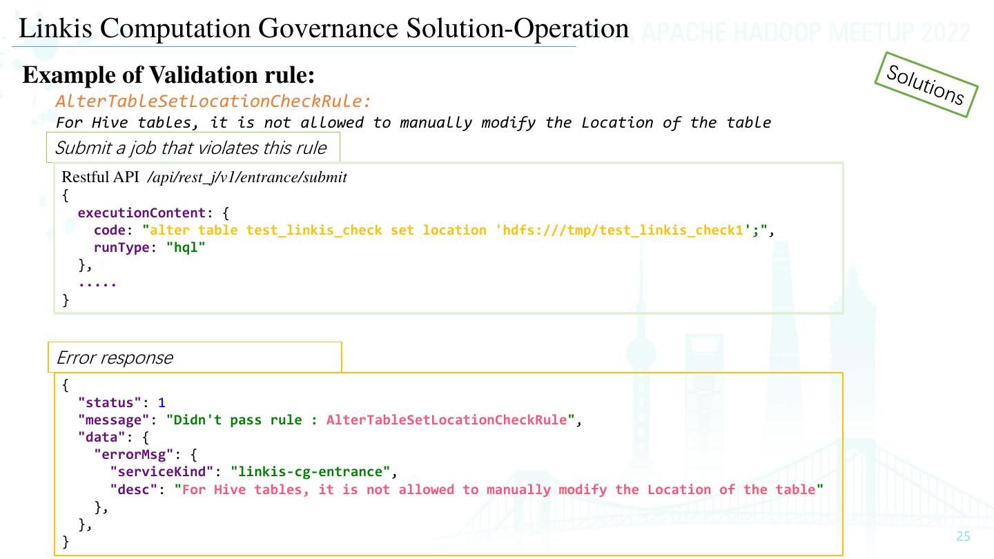 25 .Linkis Computation Governance Solution-Operation Example of Validation rule: AlterTableSetLocationCheckRule: For Hive tables, it is not allowed to manually modify the Location of the table Submit a job that violates this rule Restful API /api/rest_j/v1/entrance/submit { executionContent: { code: "alter table test_linkis_check set location 'hdfs:///tmp/test_linkis_check1';", runType: "hql" }, ..... } Error response { "status": 1 "message": "Didn't pass rule : AlterTableSetLocationCheckRule", "data": { "errorMsg": { "serviceKind": "linkis-cg-entrance", "desc": "For Hive tables, it is not allowed to manually modify the Location of the table" }, }, }