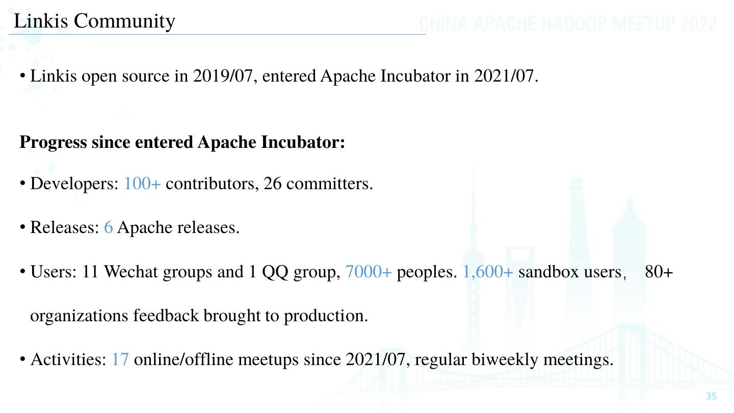 20 .Linkis Computation Governance Solution-Operation • Multi-tenant, label-based multilevel fine-grained resource control. • Multilevel parameter configuration. Tenant→User → App/Tool → EC Type → EC (User, App/Tool) (EC Type, Version) EC