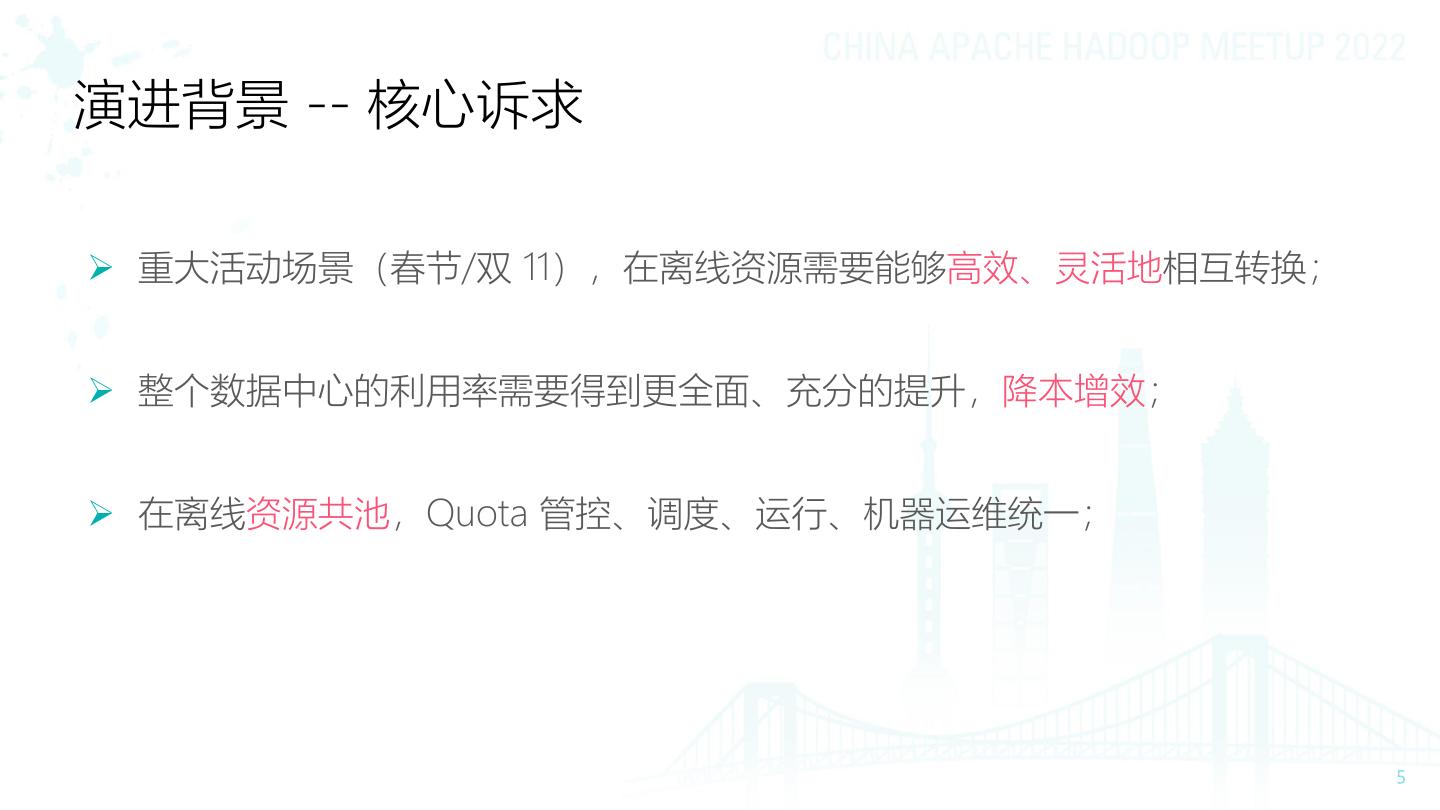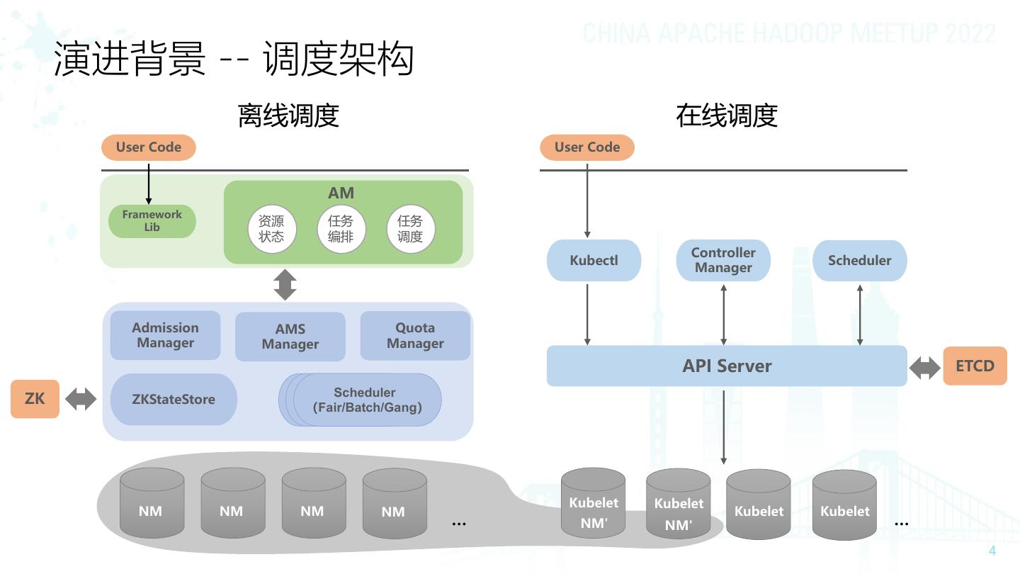 4 . 演进背景 -- 调度架构 离线调度 在线调度 User Code User Code AM Framework Lib 资源 任务 任务 状态 编排 调度 Controller Kubectl Scheduler Manager Admission AMS Quota Manager Manager Manager API Server ETCD Scheduler Scheduler Scheduler ZK ZKStateStore (Fair/Batch/Gang) (Fair/Batch/Gang) (Fair/Batch/Gang) Kubelet Kubelet Kubelet Kubelet NM NM NM NM ... NM' NM' ...