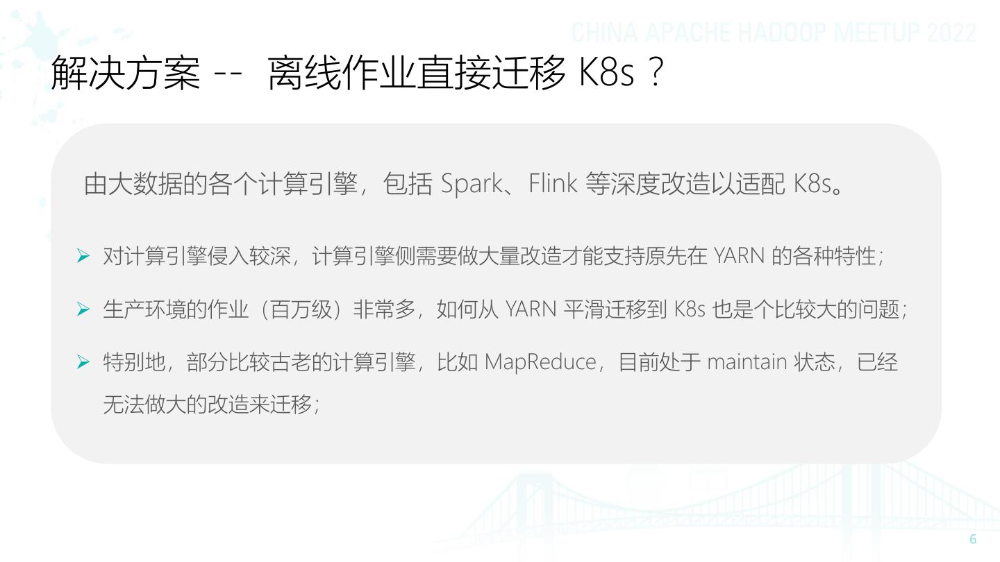 6 .解决方案 -- 离线作业直接迁移 K8s ? 由大数据的各个计算引擎,包括 Spark、Flink 等深度改造以适配 K8s。 ➢ 对计算引擎侵入较深,计算引擎侧需要做大量改造才能支持原先在 YARN 的各种特性; ➢ 生产环境的作业(百万级)非常多,如何从 YARN 平滑迁移到 K8s 也是个比较大的问题; ➢ 特别地,部分比较古老的计算引擎,比如 MapReduce,目前处于 maintain 状态,已经 无法做大的改造来迁移;
