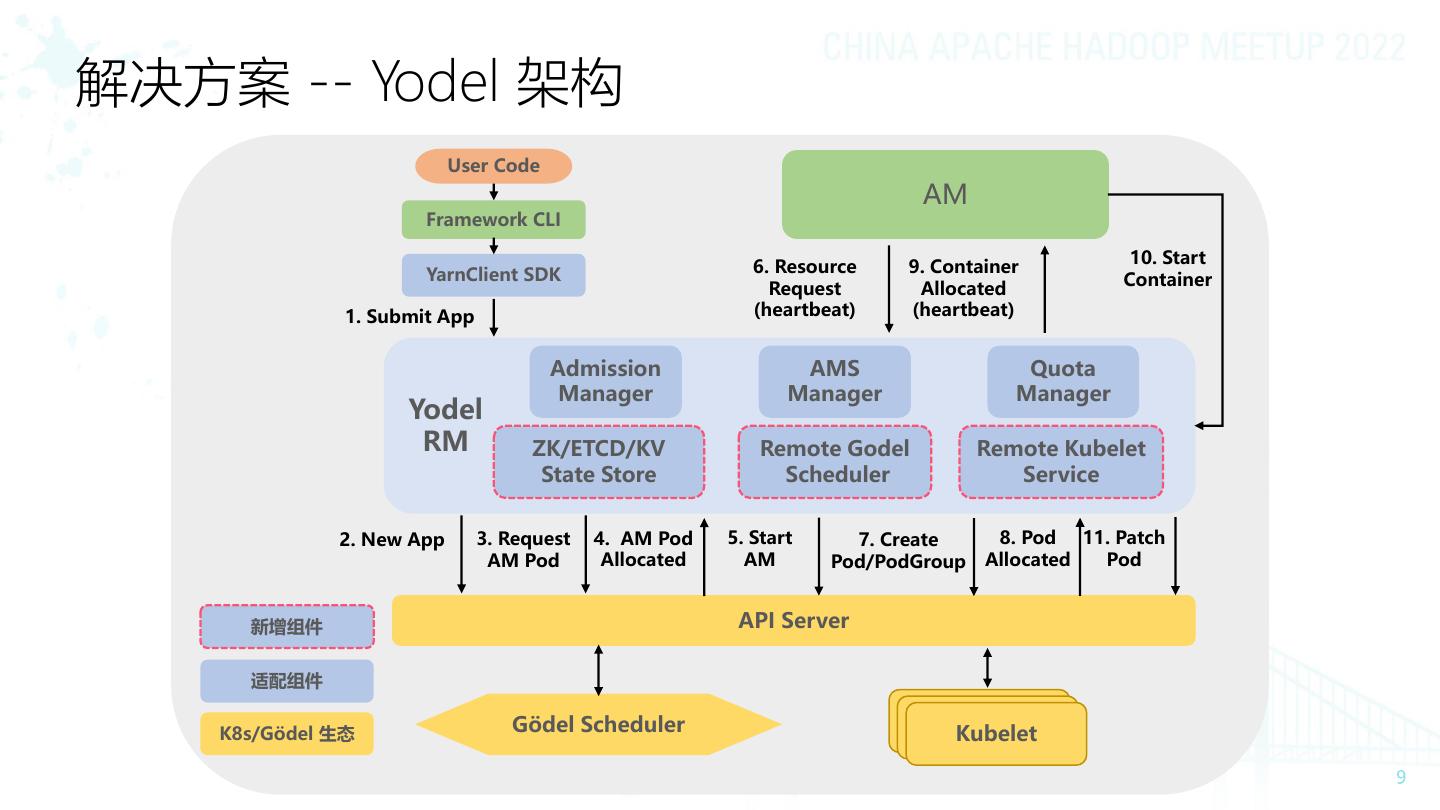 9 .解决方案 -- Yodel 架构 User Code AM Framework CLI 6. Resource 9. Container 10. Start YarnClient SDK Container Request Allocated 1. Submit App (heartbeat) (heartbeat) Admission AMS Quota Manager Manager Manager Yodel RM ZK/ETCD/KV Remote Godel Remote Kubelet State Store Scheduler Service 2. New App 3. Request 4. AM Pod 5. Start 7. Create 8. Pod 11. Patch AM Pod Allocated AM Pod/PodGroup Allocated Pod 新增组件 API Server 适配组件 Gödel Scheduler Kubelet Kubelet K8s/Gödel 生态 Kubelet