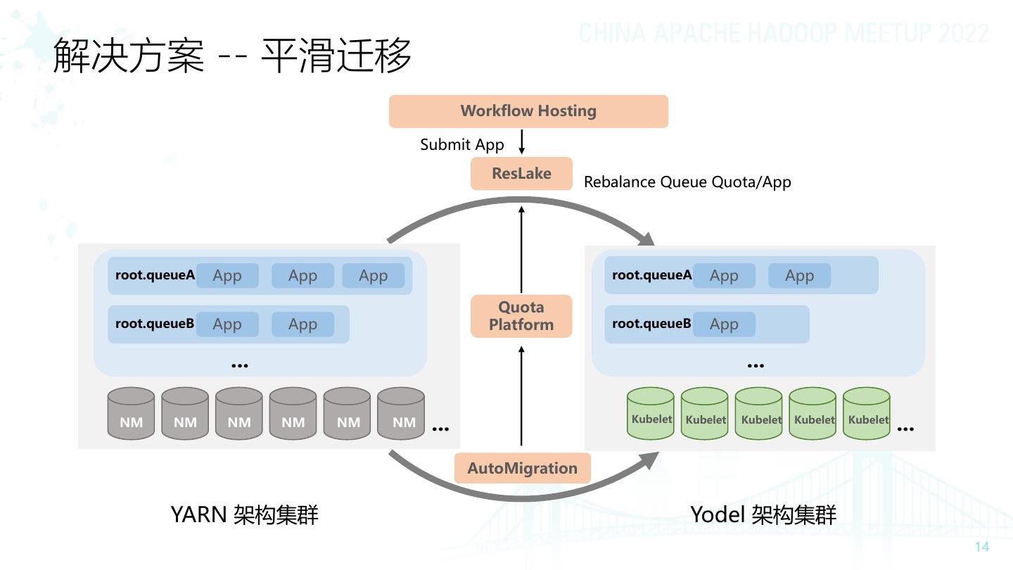 14 .解决方案 -- 平滑迁移 Workflow Hosting Submit App ResLake Rebalance Queue Quota/App root.queueA App App App root.queueA App App Quota root.queueB App App Platform root.queueB App ... ... NM NM NM NM NM NM ... Kubelet Kubelet Kubelet Kubelet Kubelet ... AutoMigration YARN 架构集群 Yodel 架构集群