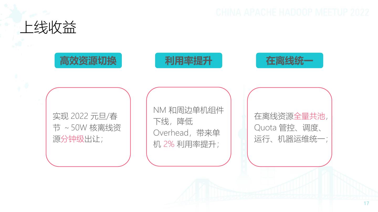 17 .上线收益 高效资源切换 利用率提升 在离线统一 NM 和周边单机组件 实现 2022 元旦/春 在离线资源全量共池, 下线,降低 节 ~50W 核离线资 Quota 管控、调度、 Overhead,带来单 源分钟级出让; 运行、机器运维统一; 机 2% 利用率提升;