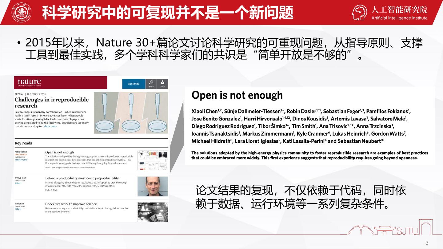 3 . 科学研究中的可复现并不是一个新问题 • 2015年以来,Nature 30+篇论文讨论科学研究的可重现问题,从指导原则、支撑 工具到最佳实践,多个学科科学家们的共识是“简单开放是不够的”。 论文结果的复现,不仅依赖于代码,同时依 赖于数据、运行环境等一系列复杂条件。 3