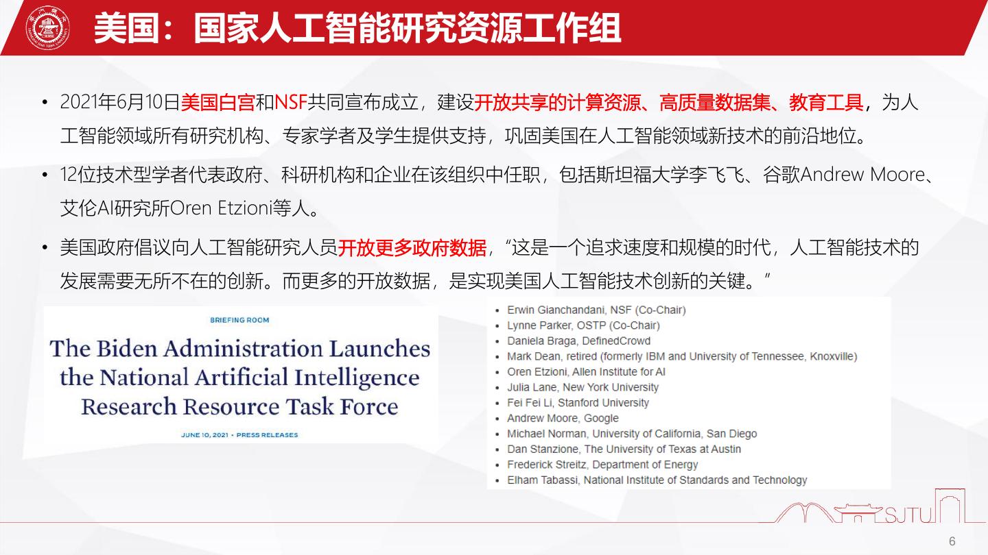 6 . 美国:国家人工智能研究资源工作组 • 2021年6月10日美国白宫和NSF共同宣布成立,建设开放共享的计算资源、高质量数据集、教育工具,为人 工智能领域所有研究机构、专家学者及学生提供支持,巩固美国在人工智能领域新技术的前沿地位。 • 12位技术型学者代表政府、科研机构和企业在该组织中任职,包括斯坦福大学李飞飞、谷歌Andrew Moore、 艾伦AI研究所Oren Etzioni等人。 • 美国政府倡议向人工智能研究人员开放更多政府数据,“这是一个追求速度和规模的时代,人工智能技术的 发展需要无所不在的创新。而更多的开放数据,是实现美国人工智能技术创新的关键。” 6