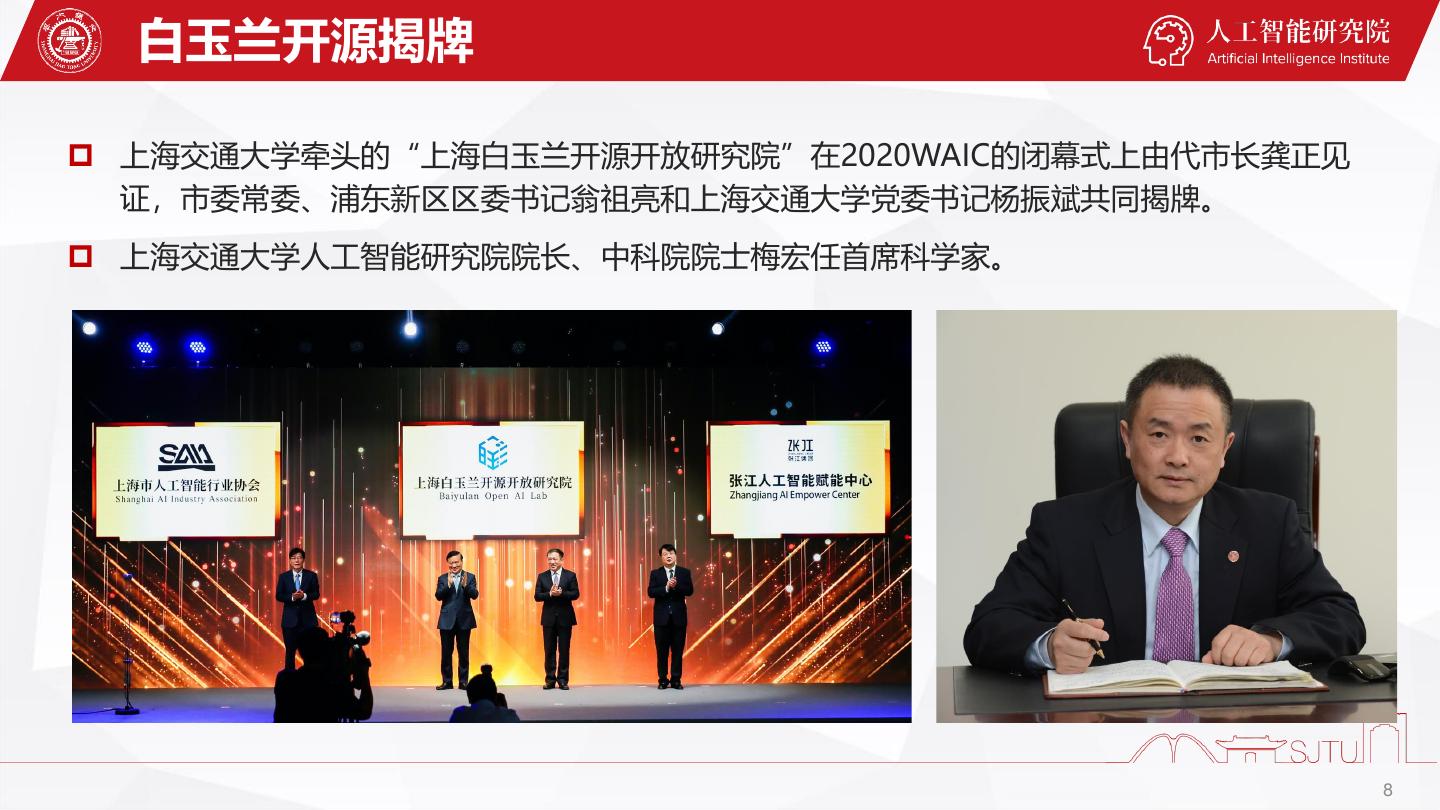 8 . 白玉兰开源揭牌 上海交通大学牵头的“上海白玉兰开源开放研究院”在2020WAIC的闭幕式上由代市长龚正见 证,市委常委、浦东新区区委书记翁祖亮和上海交通大学党委书记杨振斌共同揭牌。 上海交通大学人工智能研究院院长、中科院院士梅宏任首席科学家。 8