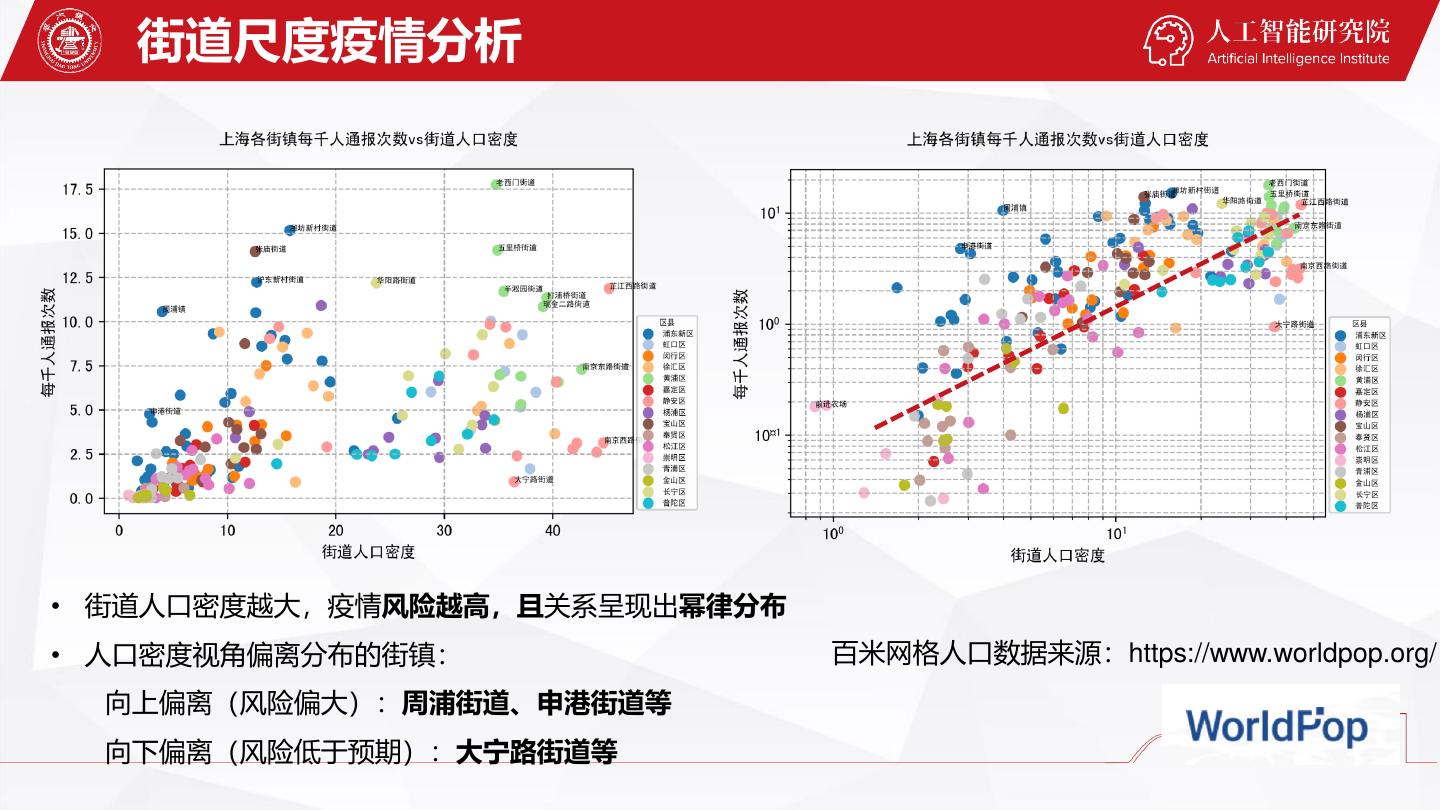 18 . 街道尺度疫情分析 • 街道人口密度越大,疫情风险越高,且关系呈现出幂律分布 • 人口密度视角偏离分布的街镇: 百米网格人口数据来源:https://www.worldpop.org/ 向上偏离(风险偏大):周浦街道、申港街道等 向下偏离(风险低于预期):大宁路街道等