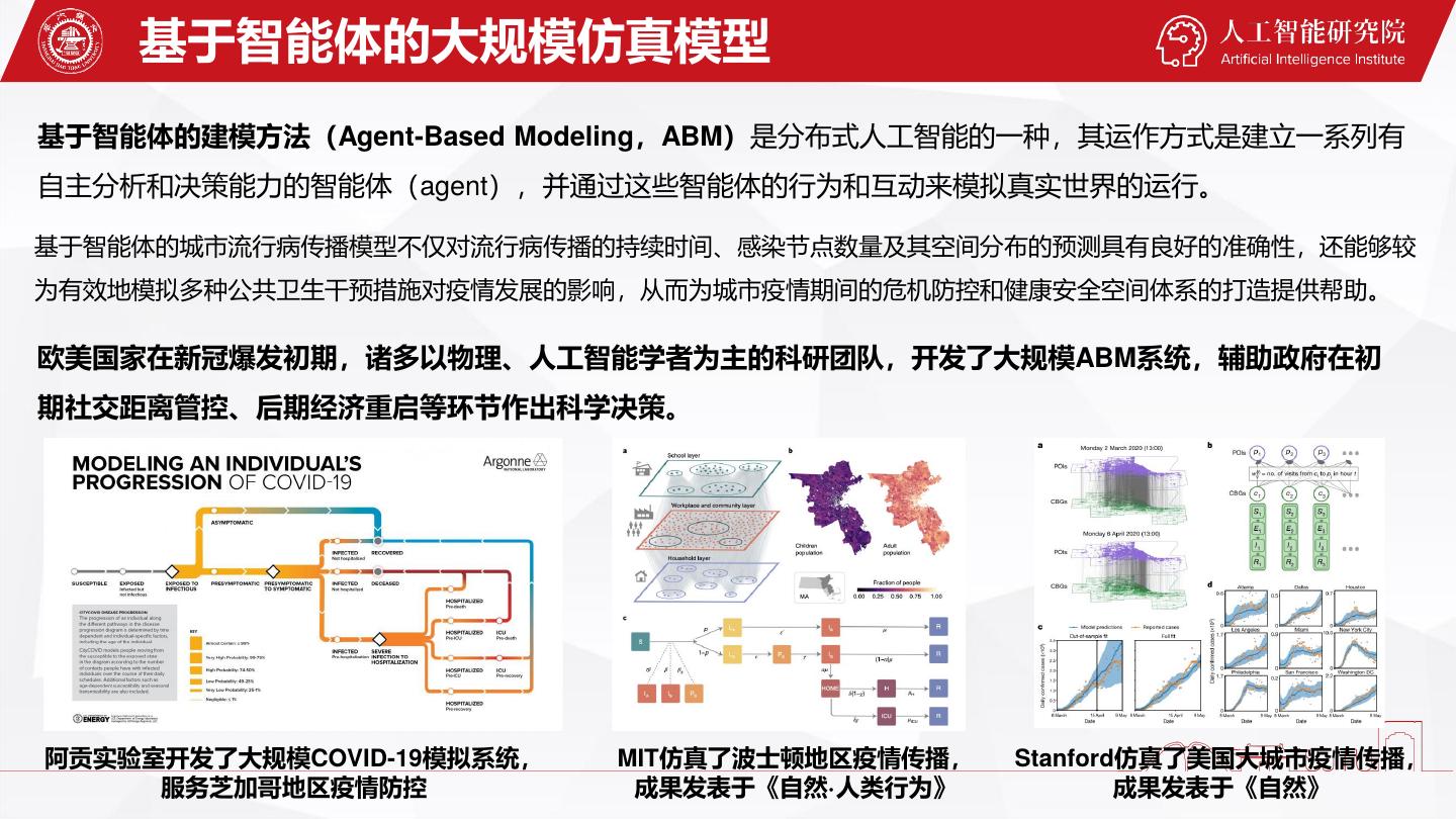 19 . 基于智能体的大规模仿真模型 基于智能体的建模方法(Agent-Based Modeling,ABM)是分布式人工智能的一种,其运作方式是建立一系列有 自主分析和决策能力的智能体(agent),并通过这些智能体的行为和互动来模拟真实世界的运行。 基于智能体的城市流行病传播模型不仅对流行病传播的持续时间、感染节点数量及其空间分布的预测具有良好的准确性,还能够较 为有效地模拟多种公共卫生干预措施对疫情发展的影响,从而为城市疫情期间的危机防控和健康安全空间体系的打造提供帮助。 欧美国家在新冠爆发初期,诸多以物理、人工智能学者为主的科研团队,开发了大规模ABM系统,辅助政府在初 期社交距离管控、后期经济重启等环节作出科学决策。 阿贡实验室开发了大规模COVID-19模拟系统, MIT仿真了波士顿地区疫情传播, Stanford仿真了美国大城市疫情传播, 服务芝加哥地区疫情防控 成果发表于《自然·人类行为》 成果发表于《自然》