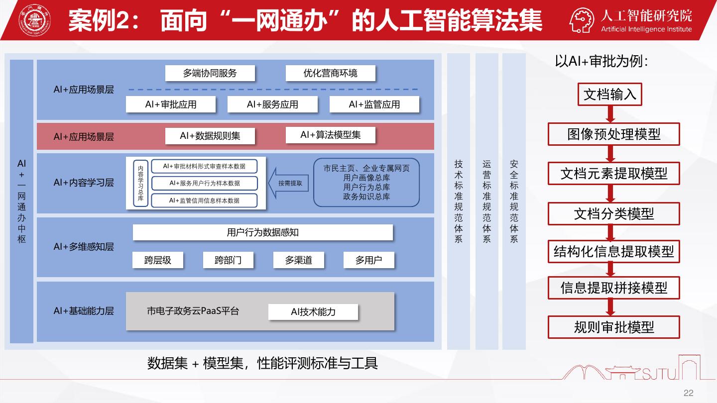 22 . 案例2: 面向“一网通办”的人工智能算法集 以AI+审批为例: 多端协同服务 优化营商环境 AI+应用场景层 文档输入 AI+审批应用 AI+服务应用 AI+监管应用 AI+应用场景层 AI+数据规则集 AI+算法模型集 图像预处理模型 AI 内 AI+审批材料形式审查样本数据 市民主页、企业专属网页 技 运 安 + 容 用户画像总库 术 营 全 文档元素提取模型 一 AI+内容学习层 学 习 AI+服务用户行为样本数据 按需提取 用户行为总库 标 标 标 总 网 库 AI+监管信用信息样本数据 政务知识总库 准 准 准 通 规 规 规 办 范 范 范 文档分类模型 中 用户行为数据感知 体 体 体 枢 系 系 系 AI+多维感知层 结构化信息提取模型 跨层级 跨部门 多渠道 多用户 信息提取拼接模型 AI+基础能力层 市电子政务云PaaS平台 AI技术能力 规则审批模型 数据集 + 模型集,性能评测标准与工具 22