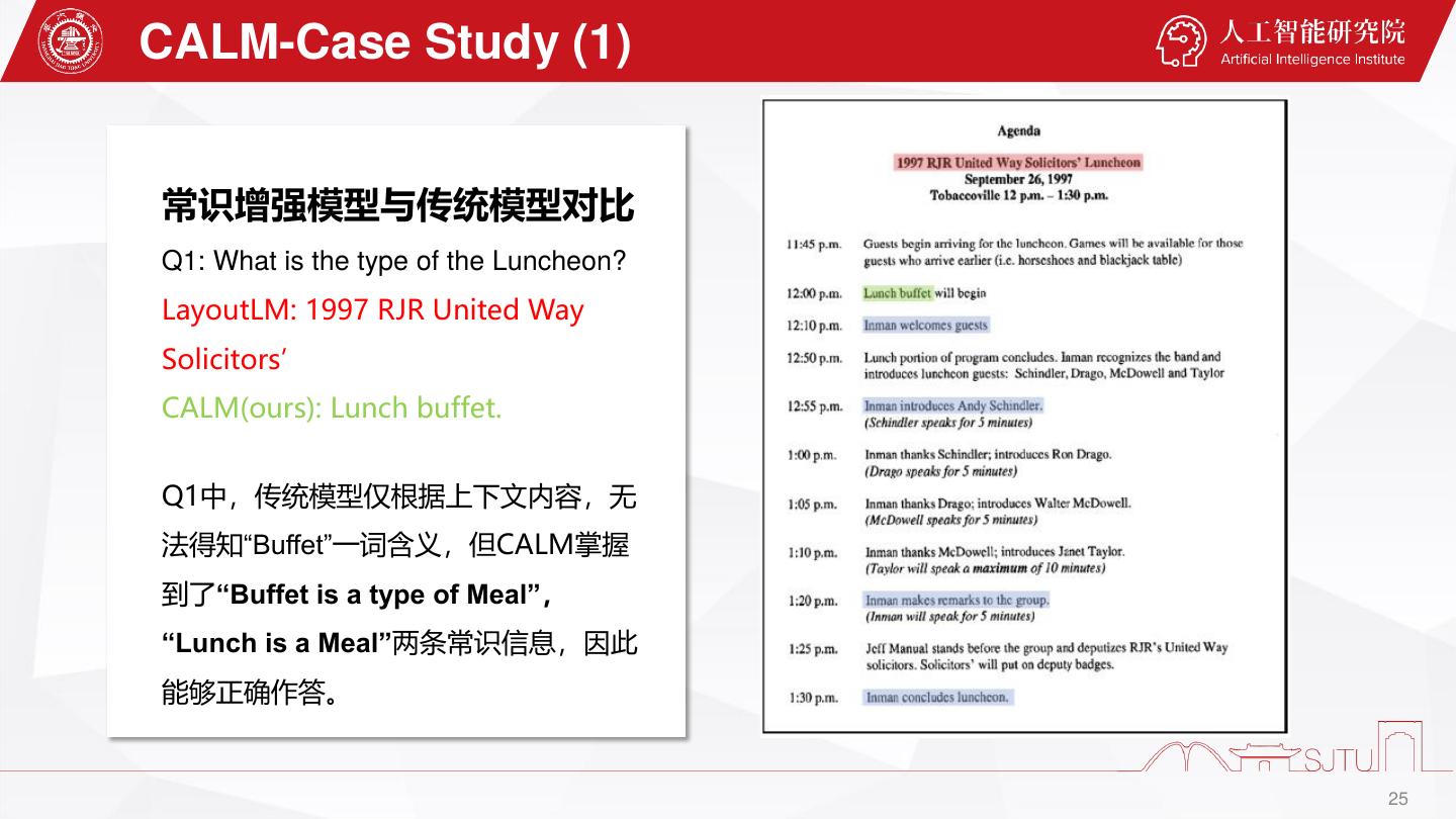25 .CALM-Case Study (1) 常识增强模型与传统模型对比 Q1: What is the type of the Luncheon? LayoutLM: 1997 RJR United Way Solicitors’ CALM(ours): Lunch buffet. Q1中,传统模型仅根据上下文内容,无 法得知“Buffet”一词含义,但CALM掌握 到了“Buffet is a type of Meal”, “Lunch is a Meal”两条常识信息,因此 能够正确作答。 25
