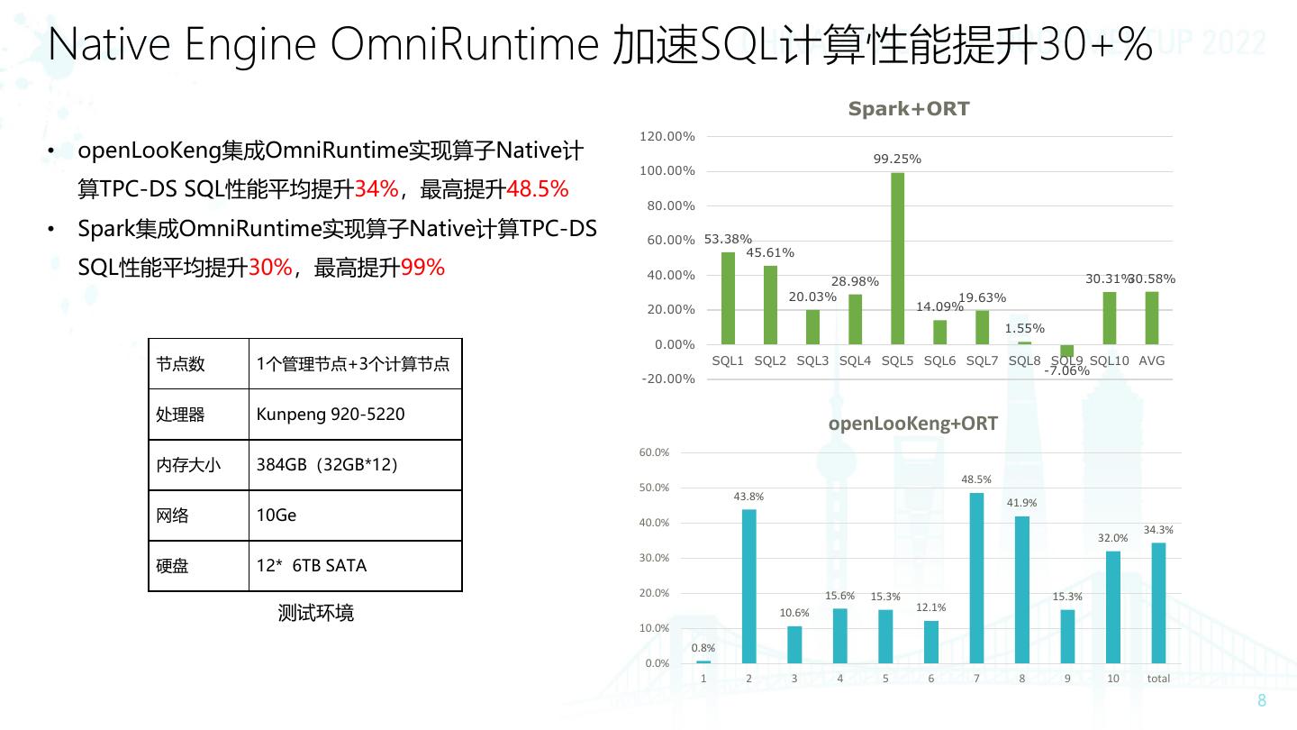 7 .端到端全栈优化,软硬协同,打造下一代大数据基础架构 Compute Engine 5 openLooKeng Spark Hive 1 CPU-Bound • 向量化执行优化 Native Engine 4 • 列式内存格式 向量化算子 Expression Agg/Join SIMD 1 2 IO-Bound • 分布式索引 • 数据重组织 列式内存格式 Type Vector Encoding 3 Network-Bound • 存算分离 • 算子下推 湖仓一体框架 表管理 元数据管理 事务 MVCC 4 JVM-Bound • C++ based Engine • LLVM Codgen 存算协同加速 算子下推 3 Index 2 数据重组织 2 5 Engine-Bound • 统一的运行时框架 Storage Engine • 强数据一致性 HDFS S3 OBS • 减少“烟囱式”优化 ARM X86 GPU DPU