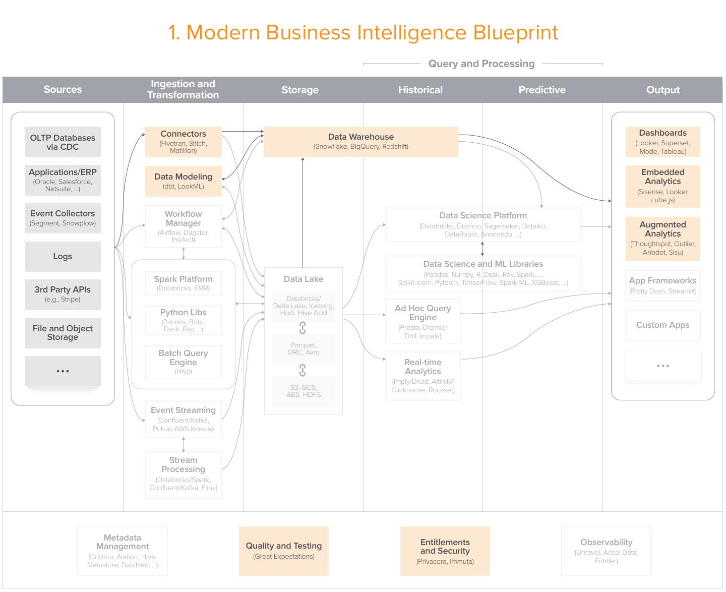 4 . 1. Modern Business Intelligence Blueprint Query and Processing Ingestion and Sources Transformation Storage Historical Predictive Output Connectors Data Warehouse Dashboards OLTP Databases (Looker, Superset, (Fivetran, Stitch, via CDC Matillion) (Snowflake, BigQuery, Redshift) Mode, Tableau) Applications/ERP Embedded (Oracle, Salesforce, Data Modeling Analytics Netsuite, ...) (dbt, LookML) (Sisense, Looker, cube.js) Event Collectors Workflow Data Science Platform (Segment, Snowplow) Manager (Databricks, Domino, Sagemaker, Dataiku, Augmented (Airflow, Dagster, DataRobot, Anaconda, ...) Analytics Prefect) (Thoughtspot, Outlier, Anodot, Sisu) Logs Data Science and ML Libraries (Pandas, Numpy, R, Dask, Ray, Spark, ... Spark Platform Data Lake Scikit-learn, Pytorch, TensorFlow, Spark ML, XGBoost, ...) App Frameworks 3rd Party APIs (Databricks, EMR) (Plotly Dash, Streamlit) (e.g., Stripe) Databricks/ Delta Lake, Iceberg, Ad Hoc Query Python Libs Hudi, Hive Acid (Pandas, Boto, Engine File and Object Dask, Ray, ...) (Presto, Dremio/ Custom Apps Storage Drill, Impala) Parquet, Batch Query ORC, Avro Engine Real-time (Hive) Analytics (Imply/Druid, Altinity/ S3, GCS, Clickhouse, Rockset) ABS, HDFS Event Streaming (Confluent/Kafka, Pulsar, AWS Kinesis) Stream Processing (Databricks/Spark, Confluent/Kafka, Flink) Metadata Management Quality and Testing Entitlements Observability and Security (Unravel, Accel Data, (Collibra, Alation, Hive, (Great Expectations) (Privacera, Immuta) Fiddler) Metastore, DataHub, ...)